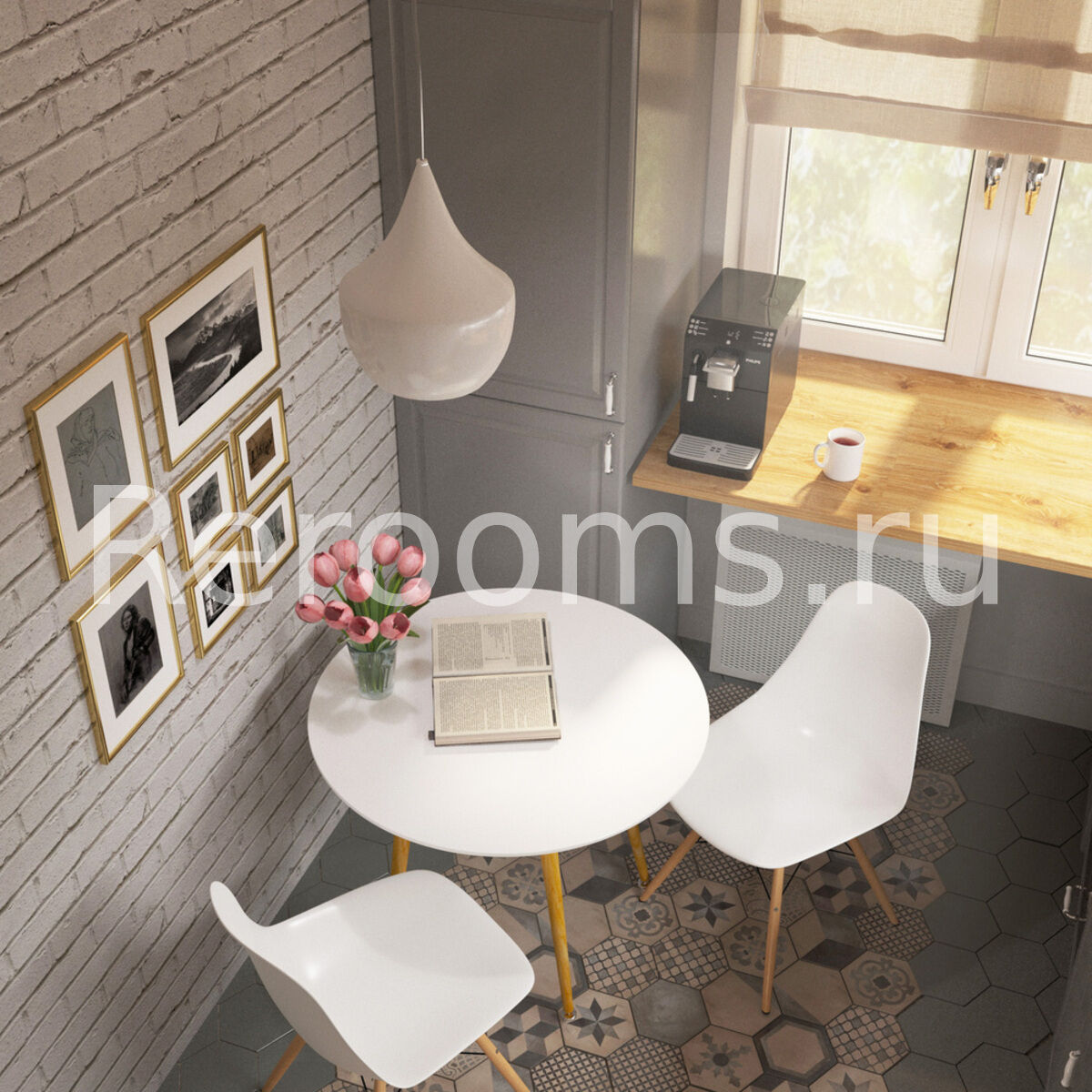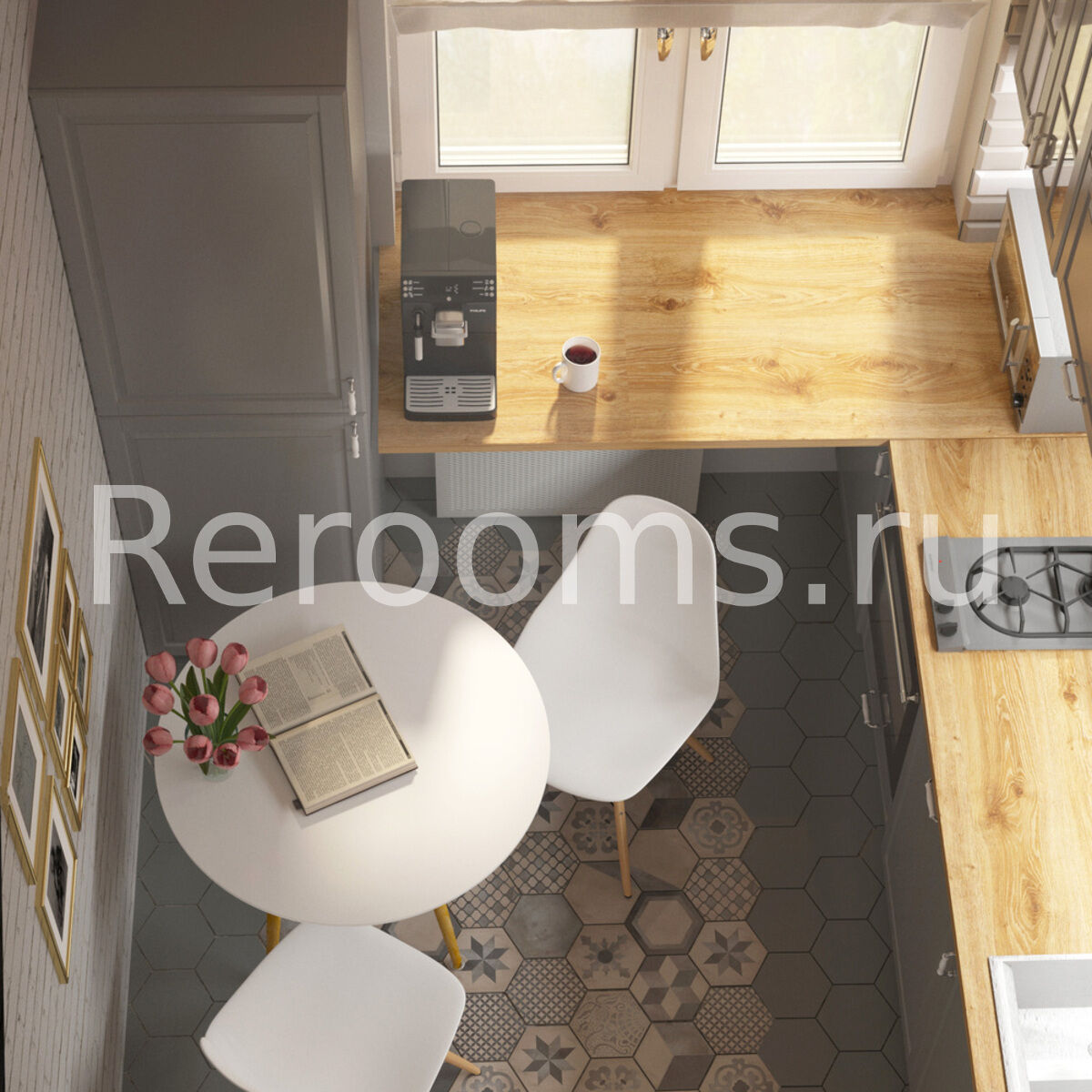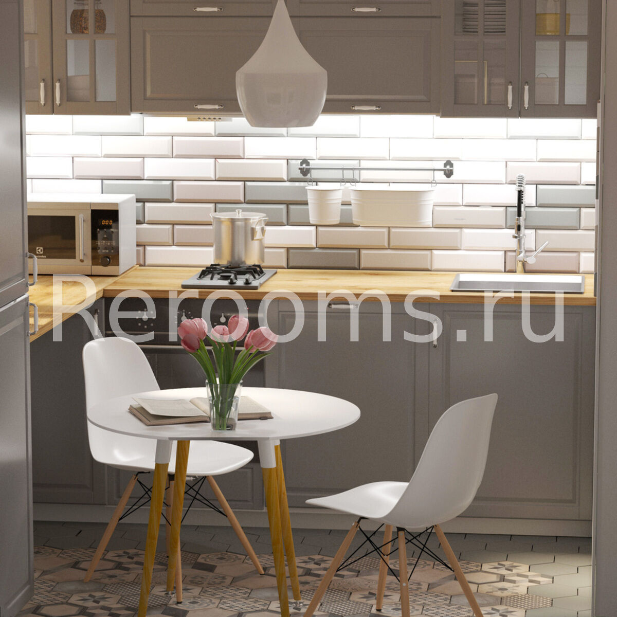 Дизайн-проект этой кухни выполнен в весьма популярном на сегодняшний день скандинавском стиле. Интерьер отличается изысканной простотой и функциональностью. Тон в помещении задает серый цвет. Серые мебельные фасады, а также плитка на фартуке и на полу формируют гармоничный и элегантный ансамбль. Мебельный гарнитур выглядит очень легко и лаконично. Рабочая поверхность под дерево делает помещение необычайно уютным и атмосферным. Грамотное расположение мебели позволяет оставить в помещении максимум свободного места.
