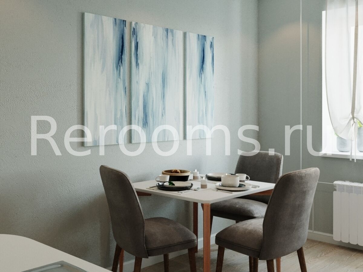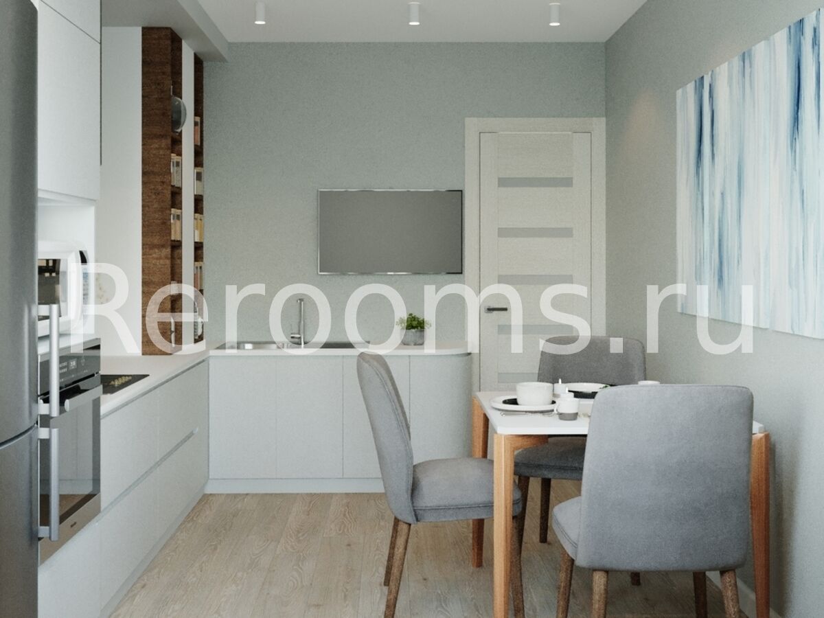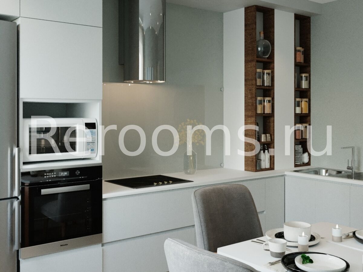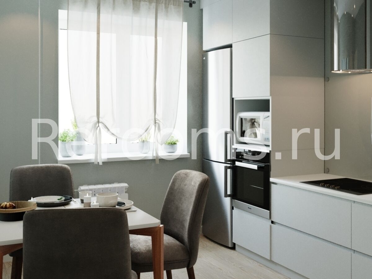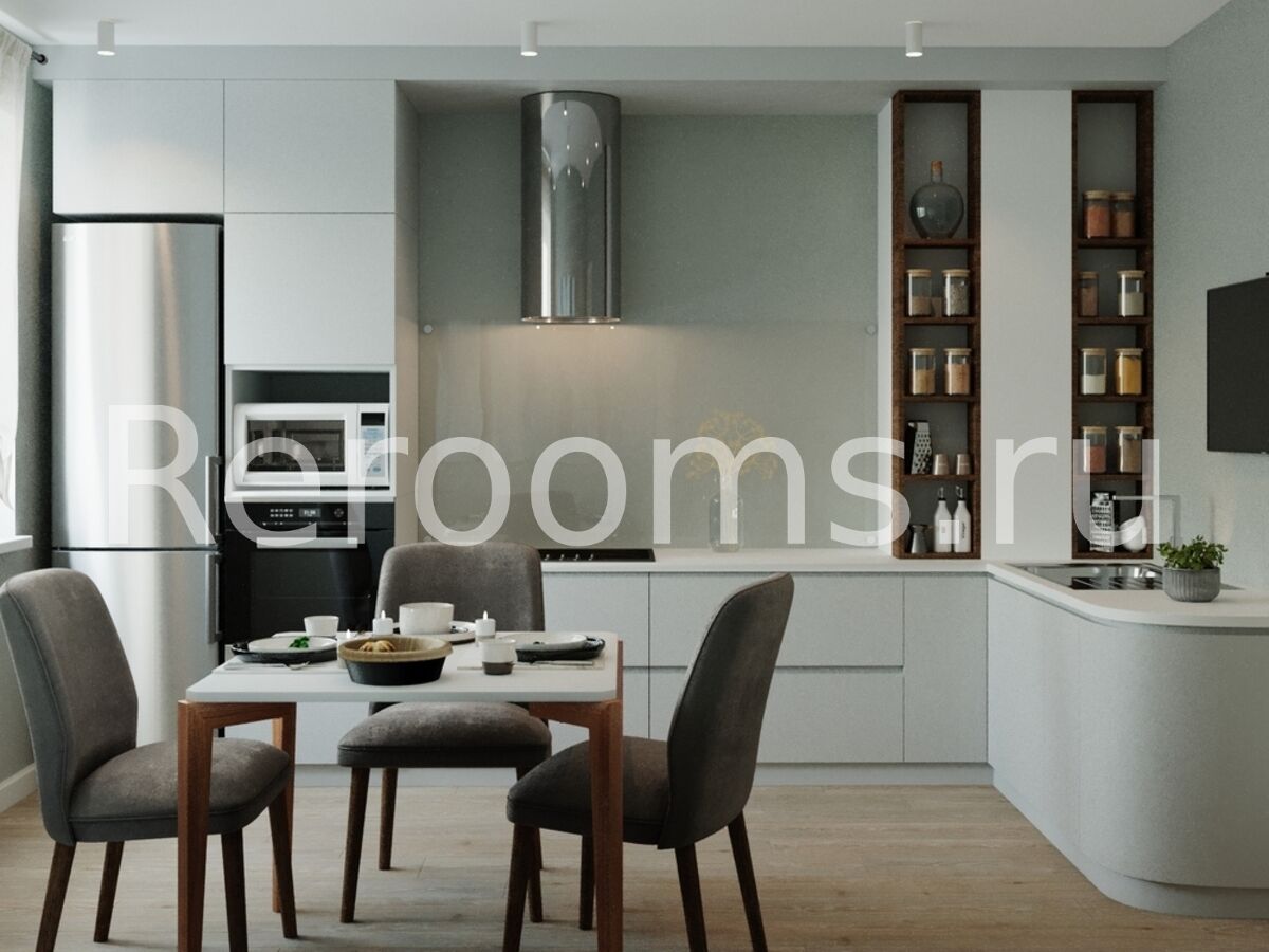 Дизайн-проект кухни выполнен в модном стиле контемпорари. Интерьер отличается простотой и функциональностью. Сдержанная палитра с использованием фисташкового, серого и белого цветов придает интерьеру благородный вид. Лаконичный мебельный гарнитур с открытыми полками выглядит очень легко и идеально соответствует стилистической концепции.