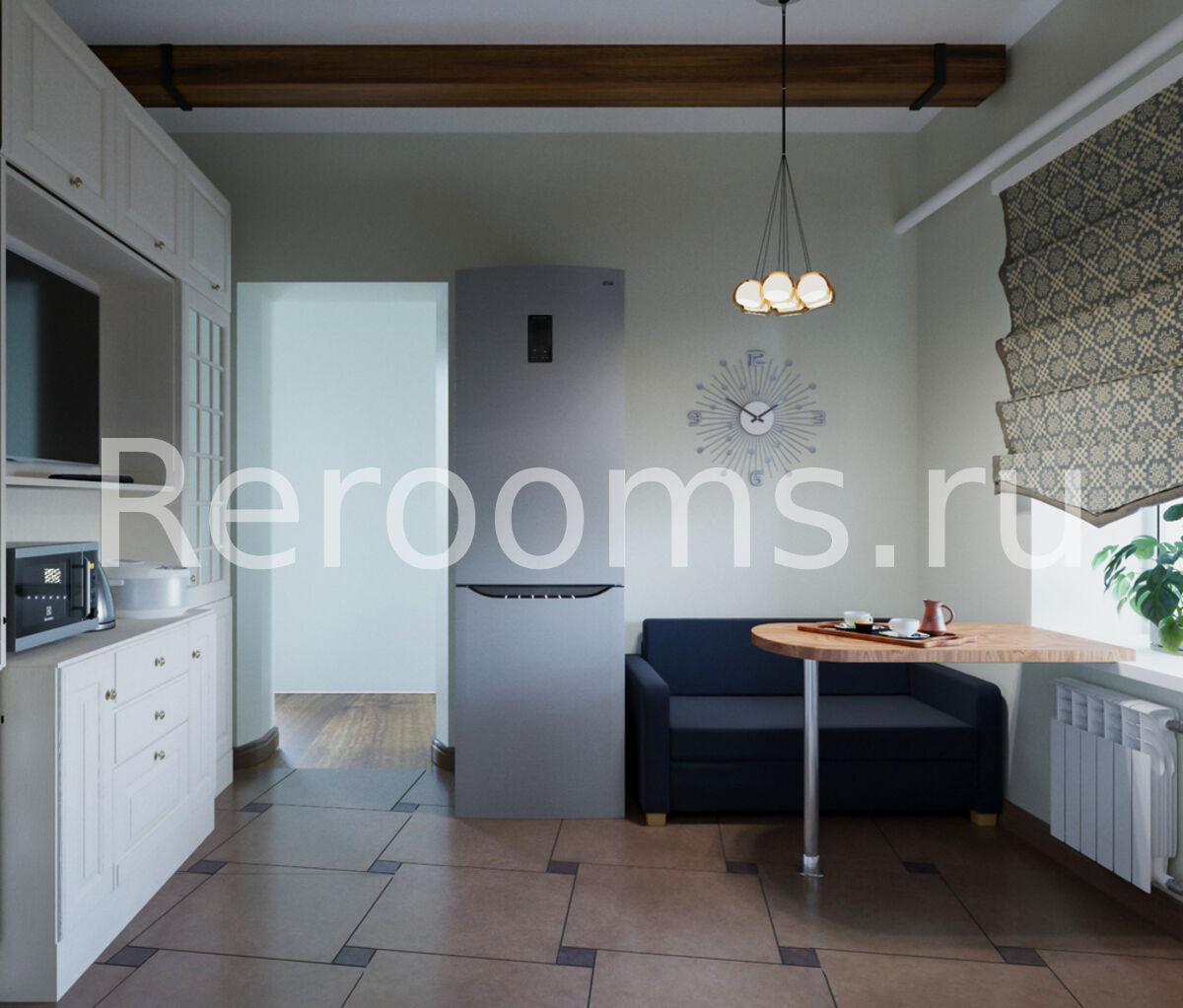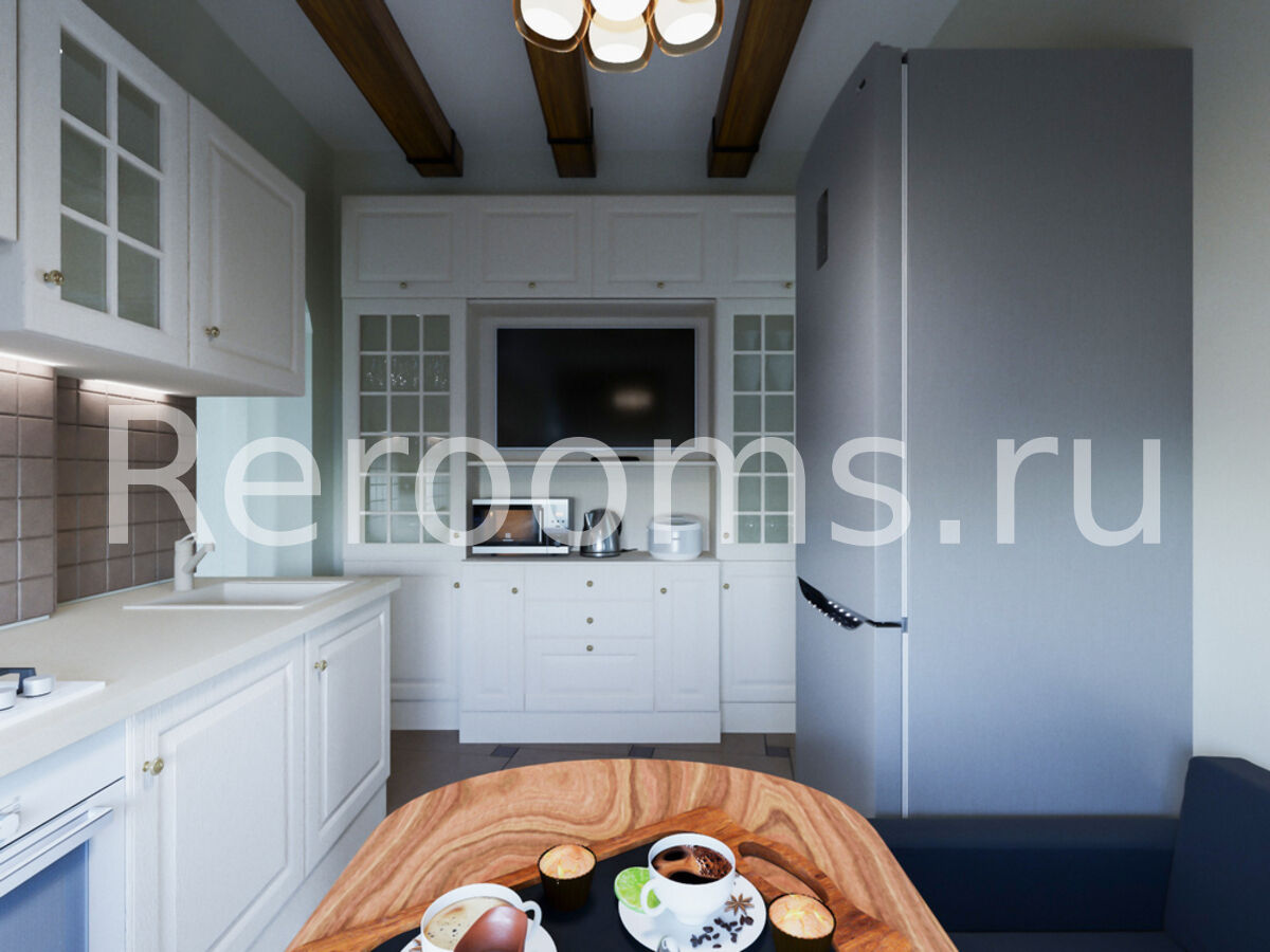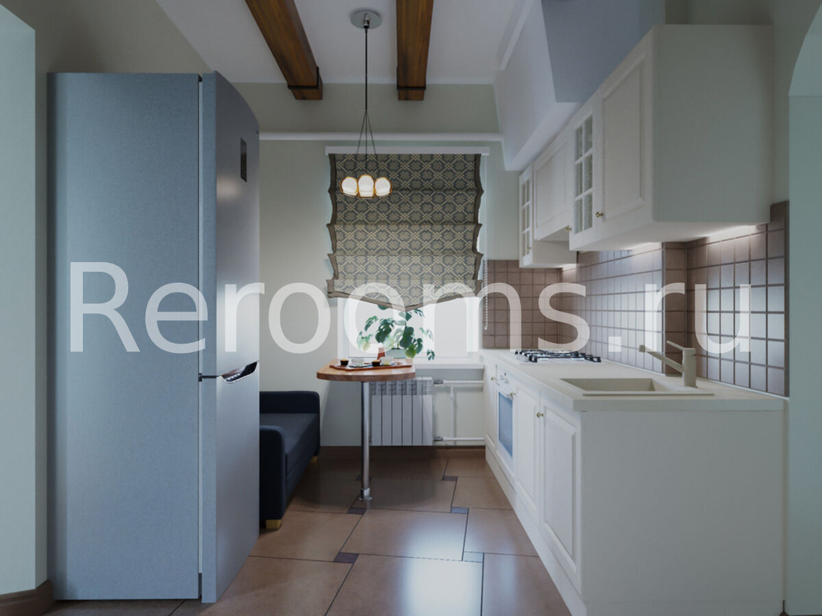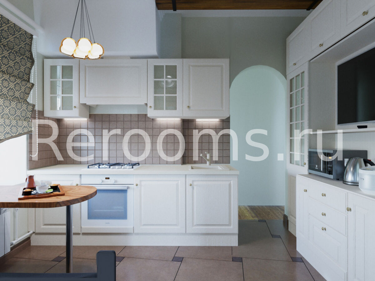Дизайн-проект в стиле Прованс поможет придать кухне очарование, присущее югу Франции, и создаст теплую, солнечную атмосферу. Интерьер этой кухни выполнен в светлых тонах, в оформлении использованы характерные для этого стиля дизайнерские приемы. Например, на потолке установили массивные балки, а на окно повесили принтованную римскую штору. Изысканный кухонный гарнитур идеально вписан в пространство и полностью отвечает выбранной стилистической концепции.