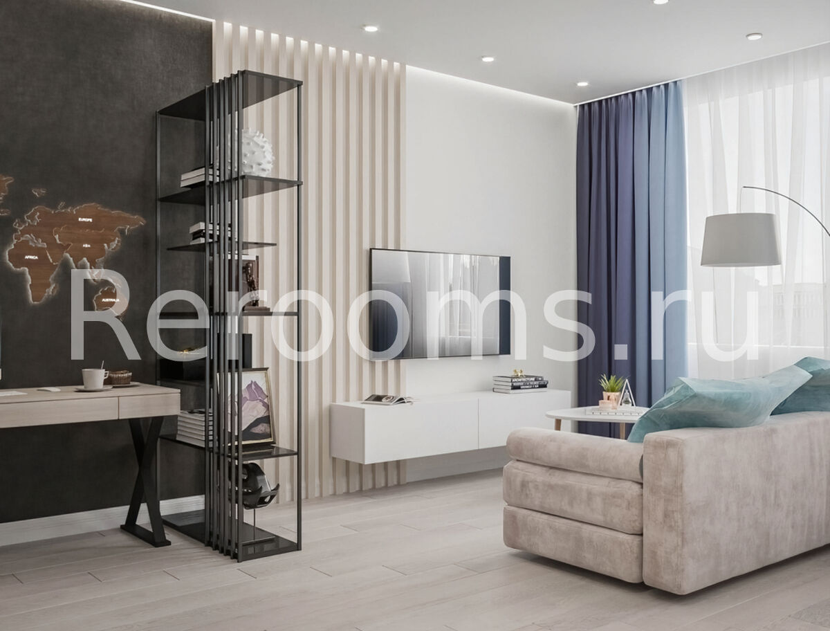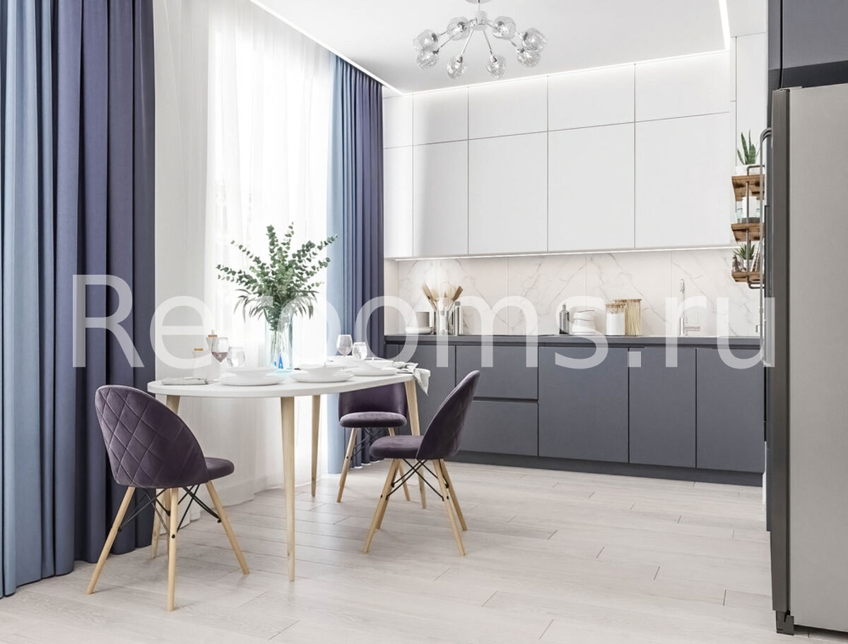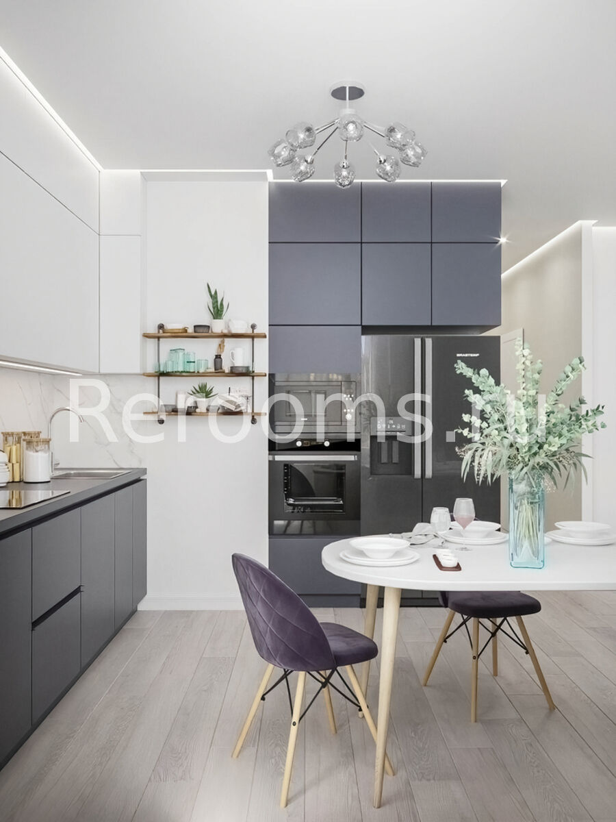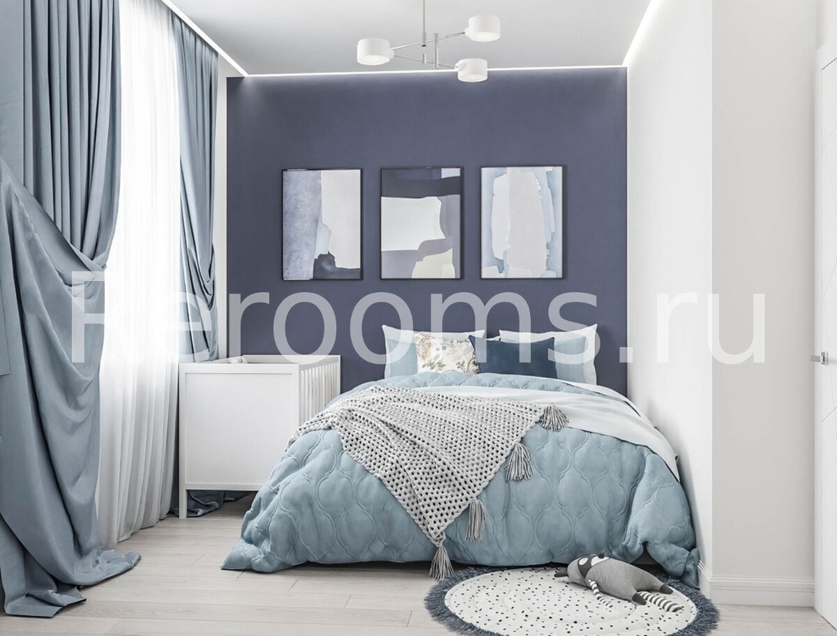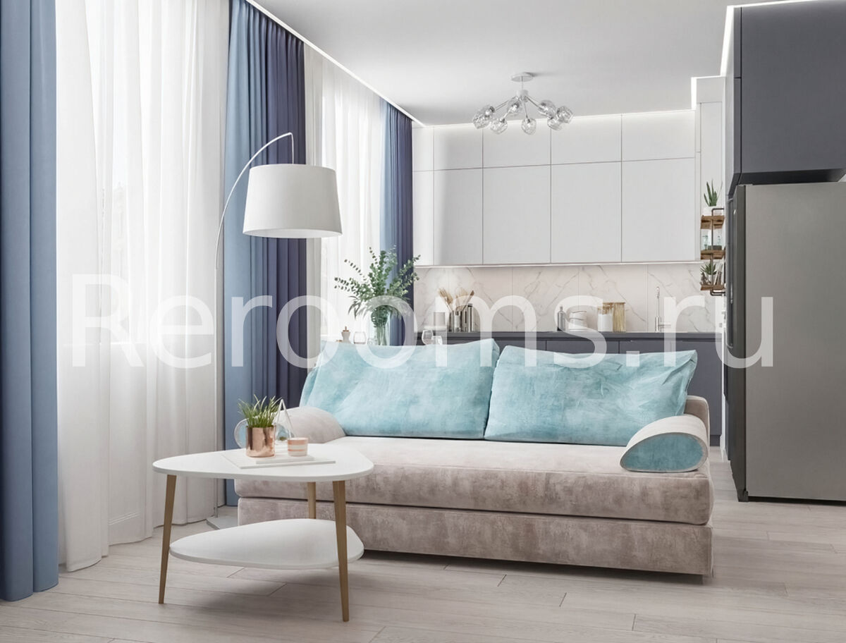 Дизайн этой двухкомнатной квартиры выдержан в современном стиле. Цветовая гамма в серо-голубых тонах делает помещение гармоничным и красивым. Интересная архитектура пространства, микс различных материалов и оригинальный световой сценарий - все это работает на общую концепцию интерьера. Каждое помещение не только эстетически привлекательно, но и функционально.