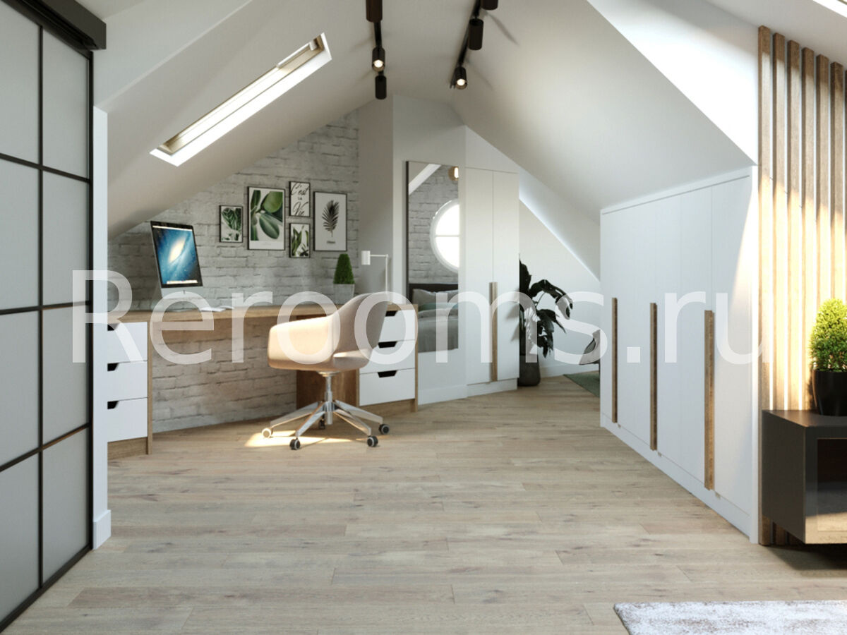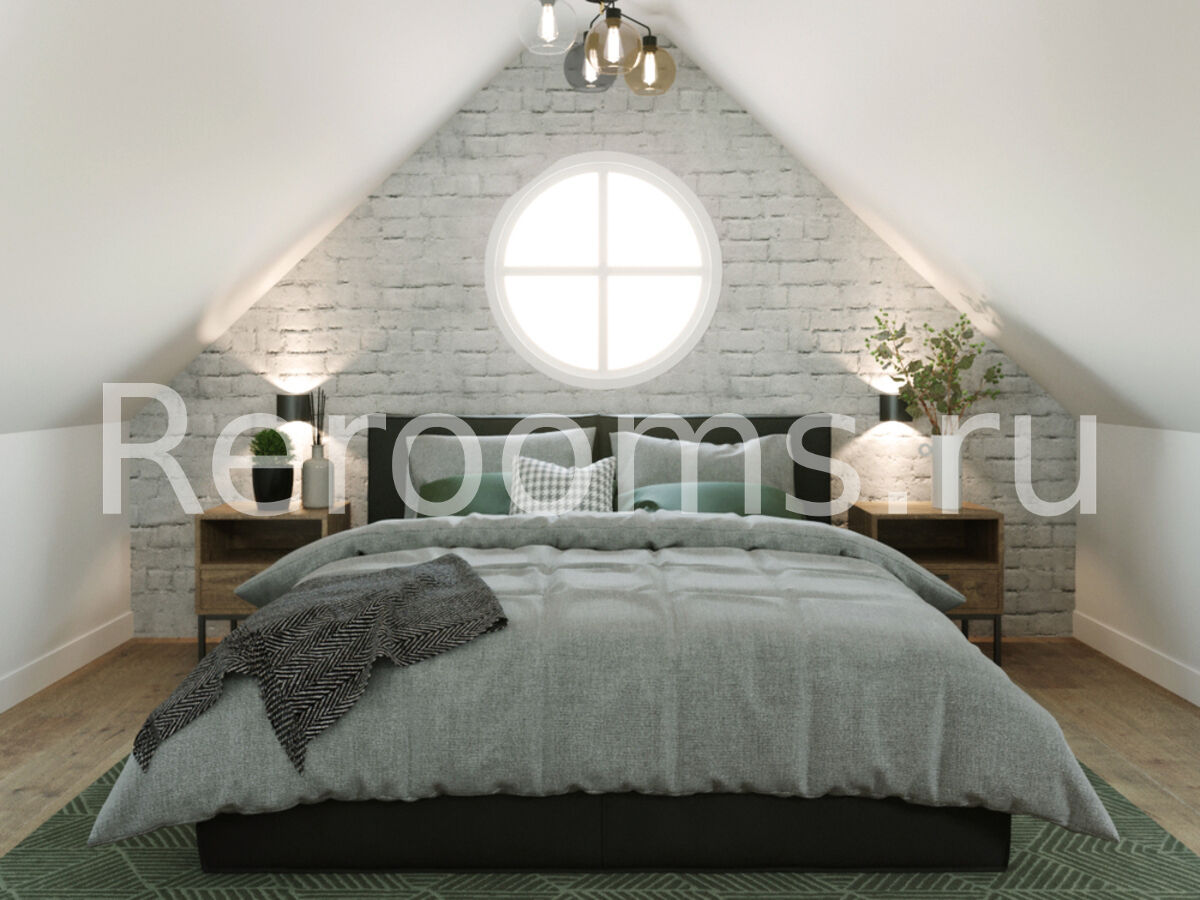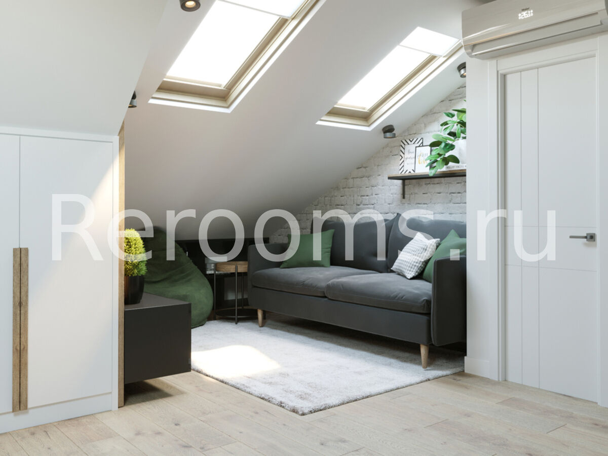 Интерьер в стиле лофт − идеальное решение для тех, кто хочет разумно использовать площадь своего жилища. Данное дизайнерское направление обладает множеством достоинств, позволяет оформлять комнаты рационально, современно и уютно. Лофт идеально подходит для обустройства квартир любой площади. В данном интерьере кирпичная кладка, современные трековые светильники, а также грубые деревянные поверхности привносят в помещение дух урбанизма, столь характерный для лофтовой стилистики. В интерьере использованы контрастные цвета, так основной белый идеально сочетается с темным графитовым и черным цветами. Изюминка интерьера - мансардная крыша с окнами. Они пропускают много света и визуально увеличивают площадь помещения.