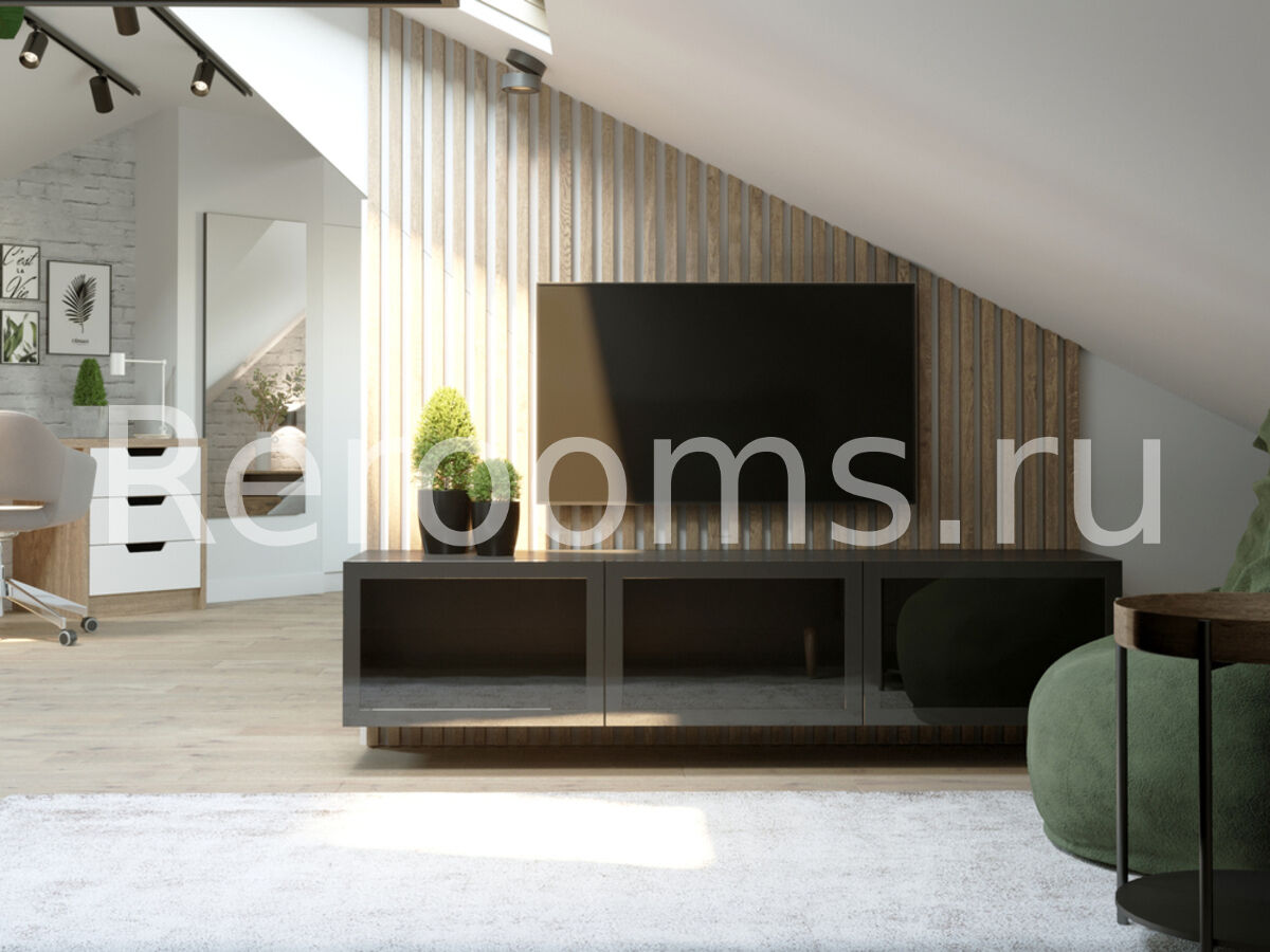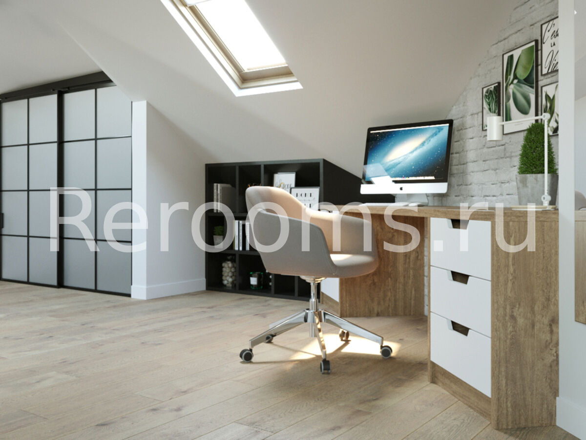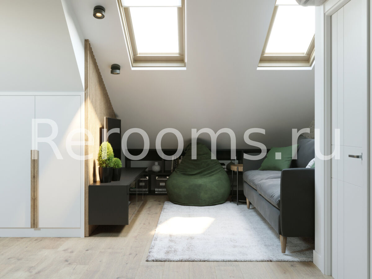 Интерьер в стиле лофт − идеальное решение для тех, кто хочет разумно использовать площадь своего жилища. Данное дизайнерское направление обладает множеством достоинств, позволяет оформлять комнаты рационально, современно и уютно. Лофт идеально подходит для обустройства квартир любой площади. В данном интерьере кирпичная кладка, современные трековые светильники, а также грубые деревянные поверхности привносят в помещение дух урбанизма, столь характерный для лофтовой стилистики. В интерьере использованы контрастные цвета, так основной белый идеально сочетается с темным графитовым и черным цветами. Изюминка интерьера - мансардная крыша с окнами. Они пропускают много света и визуально увеличивают площадь помещения.