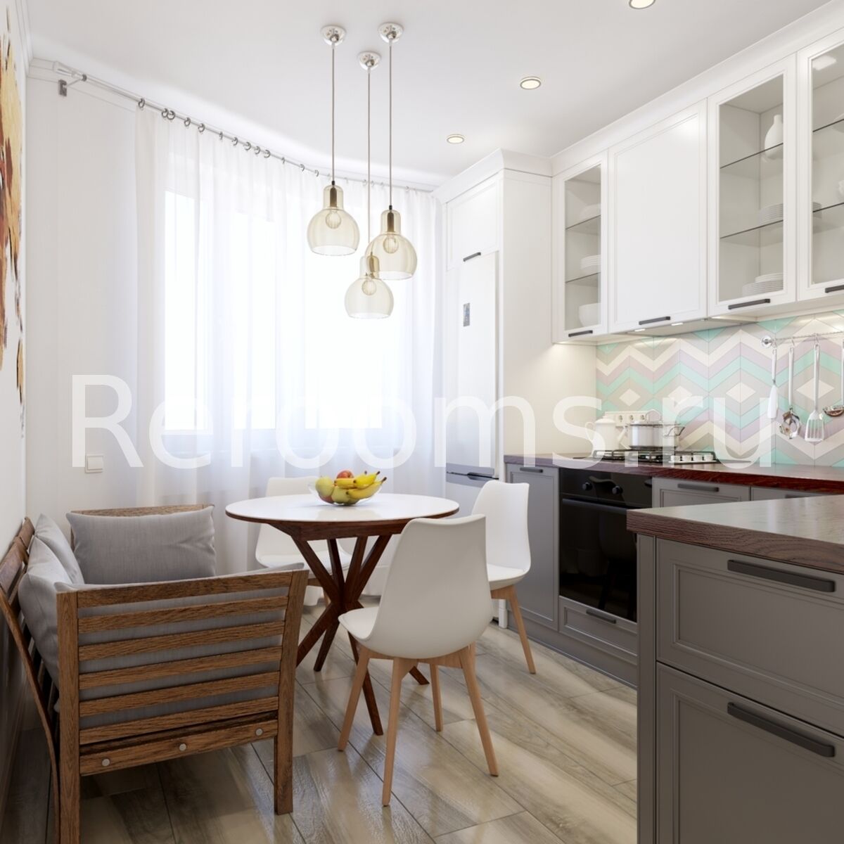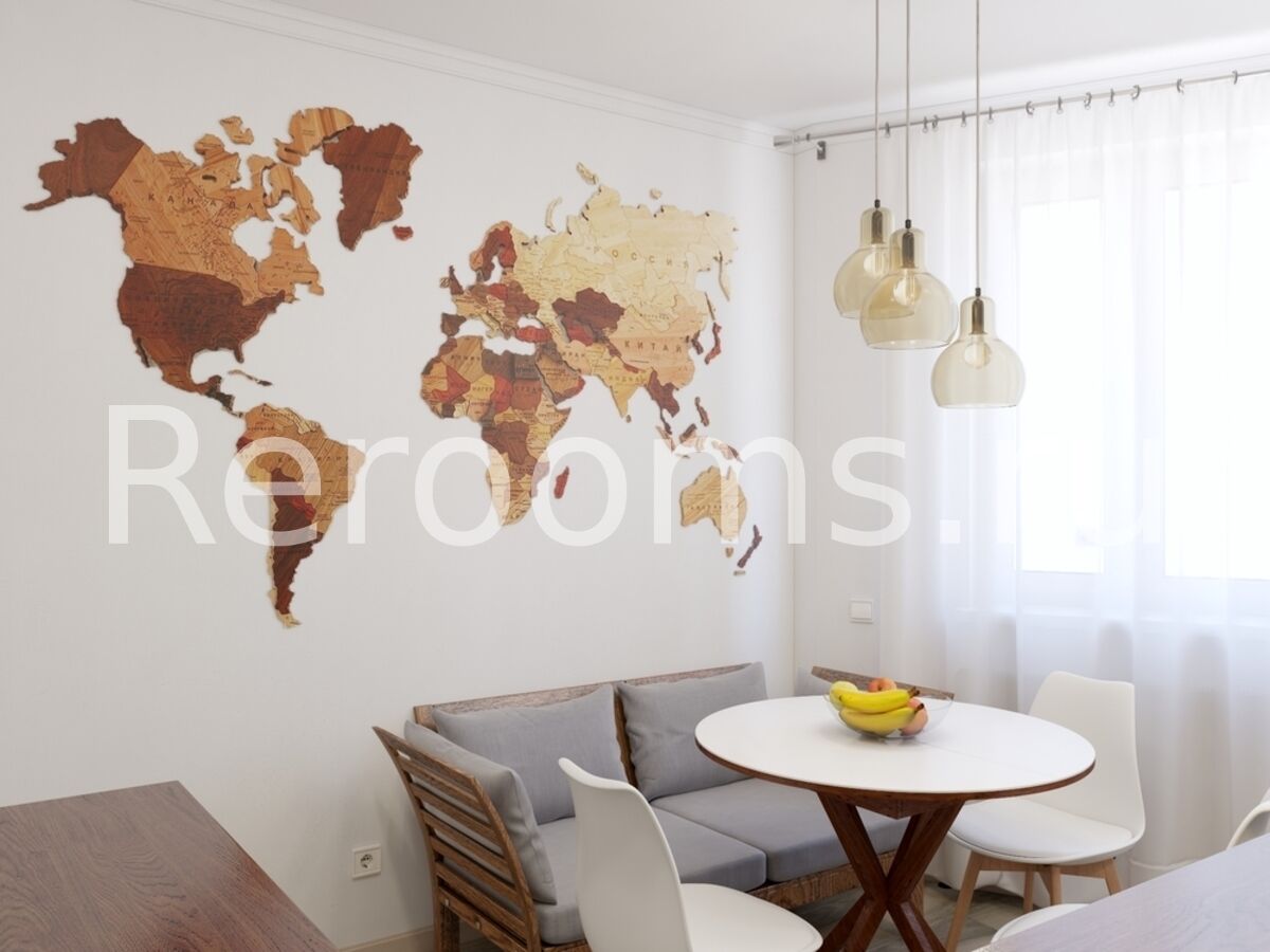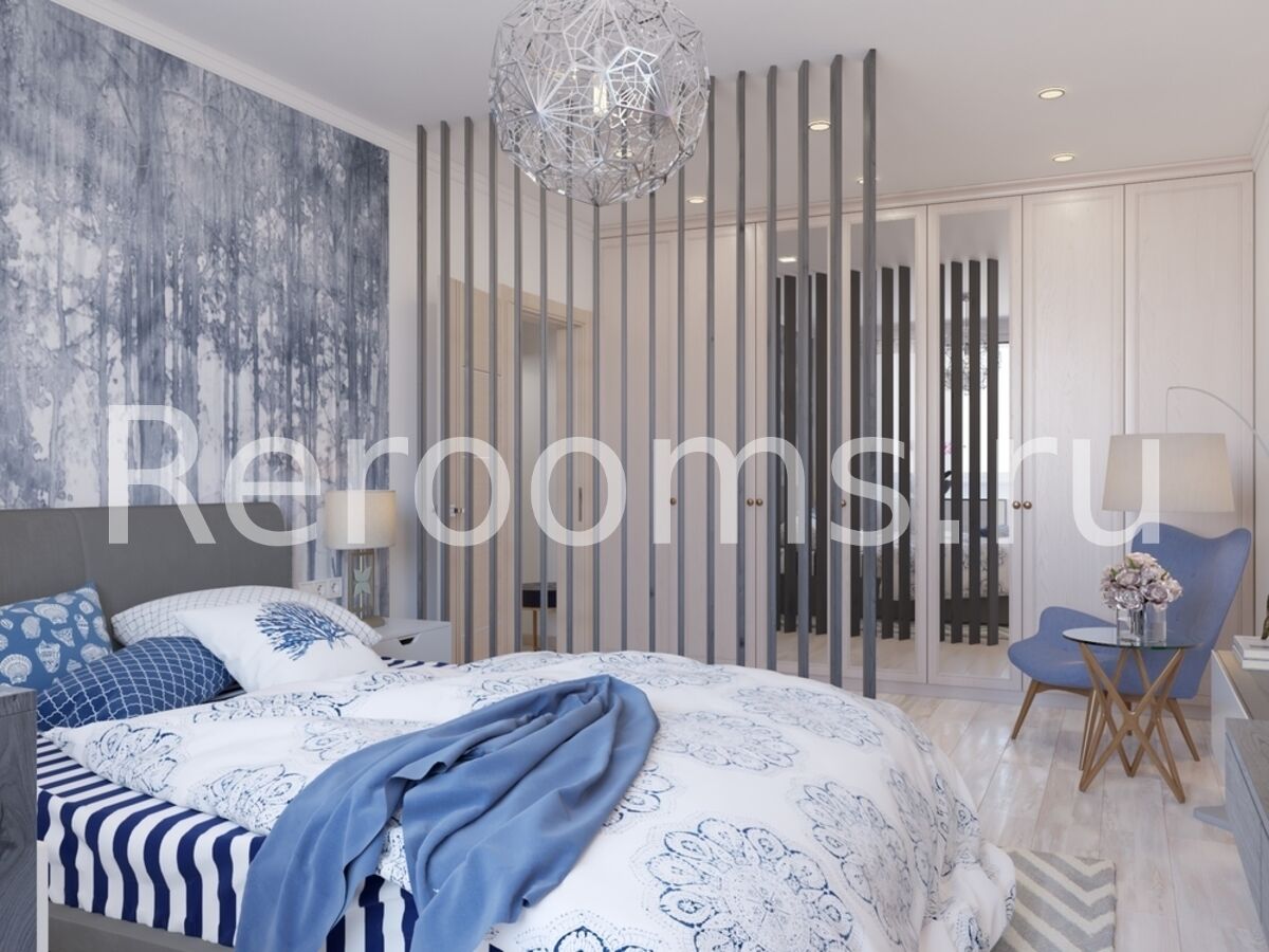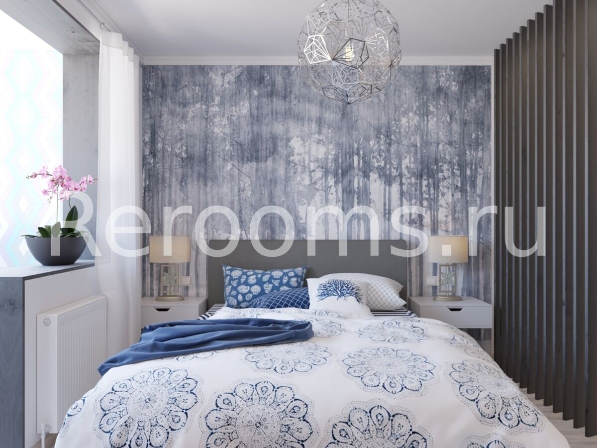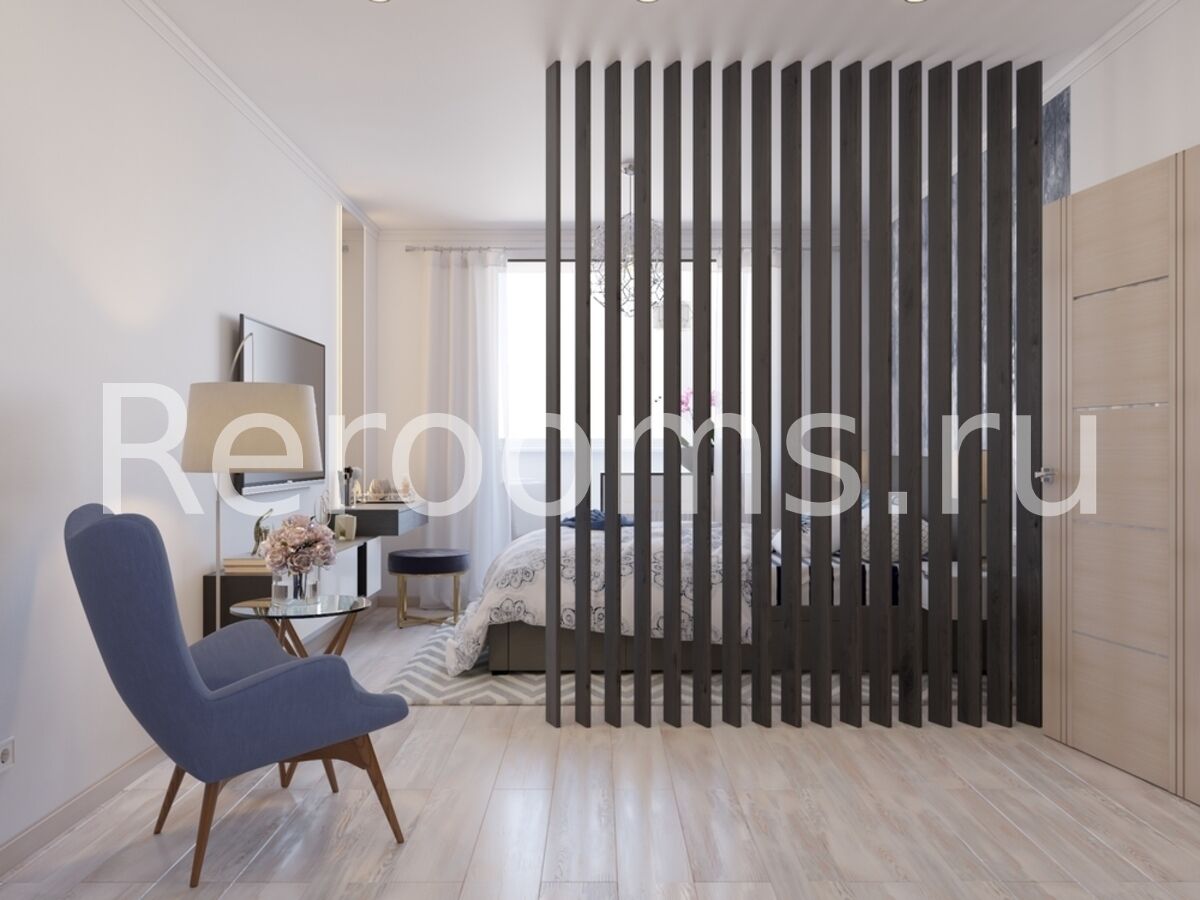 Проект этой небольшой квартиры выполнен в скандинавском стиле. Красивый лаконичный дизайн создает в помещении расслабляющую атмосферу и располагает к отдыху. В интерьере преобладают светлые тона, с использованием характерных для сканди белого, серго, голубого и цвета натурального дерева. В комнате спальную зону отделили реечными перегородками. Они визуально поделили пространство, не нарушив целостность помещения. В кухне функциональный гарнитур идеально вписали в пространство, оставив достаточно места для столовой зоны.