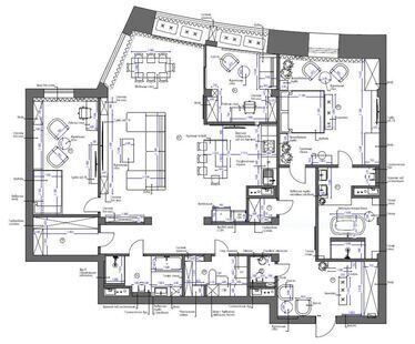 В этом эклектичном интерьере разные стилистические направления органично сочетаются, создавая единое, выразительное пространство. Дизайн четырехкомнатной квартиры выстроен с точным соблюдением общей концепции: модернизм, арт-деко и американская классика плавно дополняют друг друга, формируя гармоничную композицию. Все материалы и декоративные элементы подобраны с особым вниманием к качеству и визуальной эстетике.