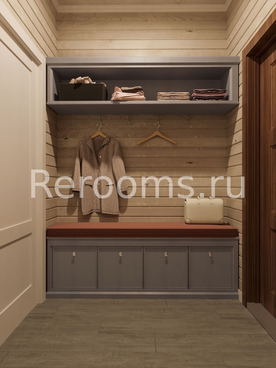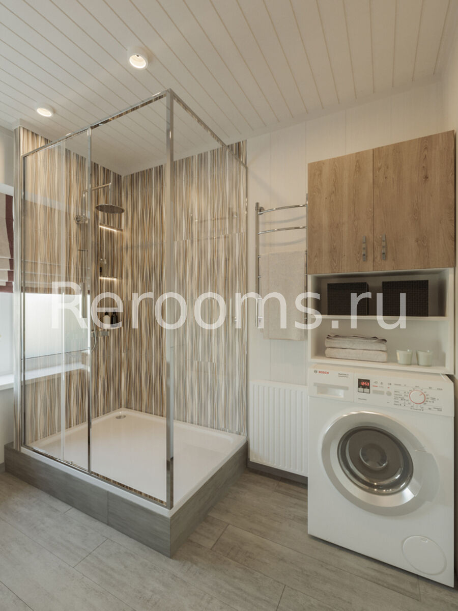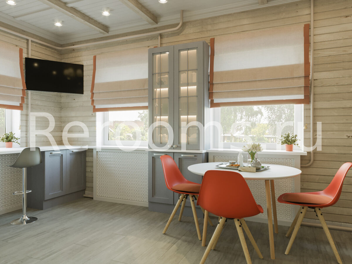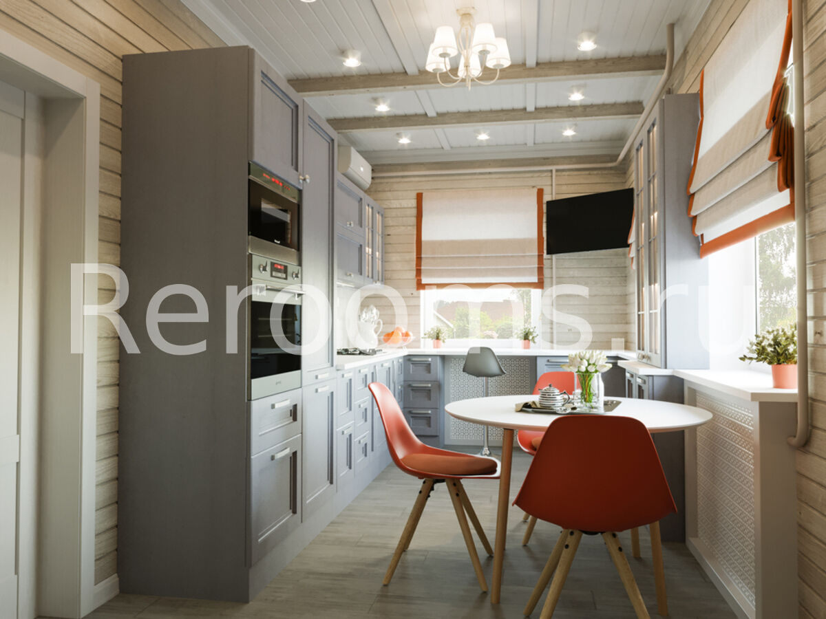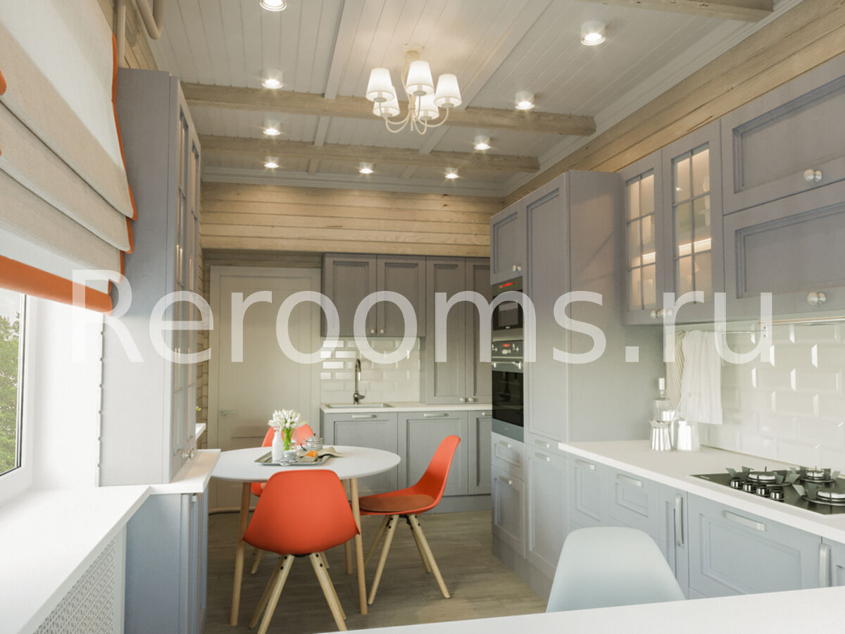Дизайн-проект кухни, санузлов и холла в этом доме выполнен в стиле контемпорари. В качестве основного отделочного материала использован фальшбрус. Он идеально передает фактуру древесины и создает в помещении особый уют. В кухне светлая цветовая гамма с в серо-бежевых тонах разбавлена яркими акцентами. Главная особенность этого пространства - потолочные балки. Они привносят в интерьер нотки прованса и придают ему особый колорит. В ванной главное место отведено функционализму. Достаточно просторное помещение не только красиво, но и очень удобно.