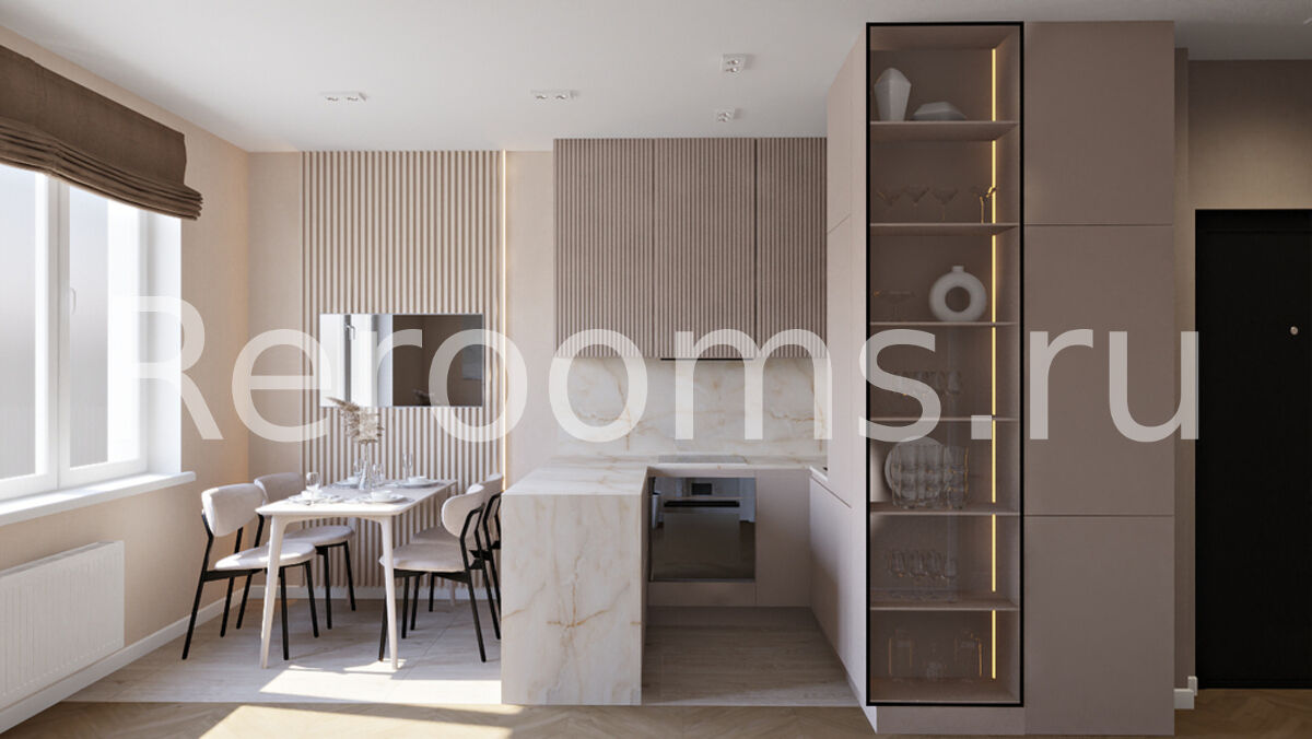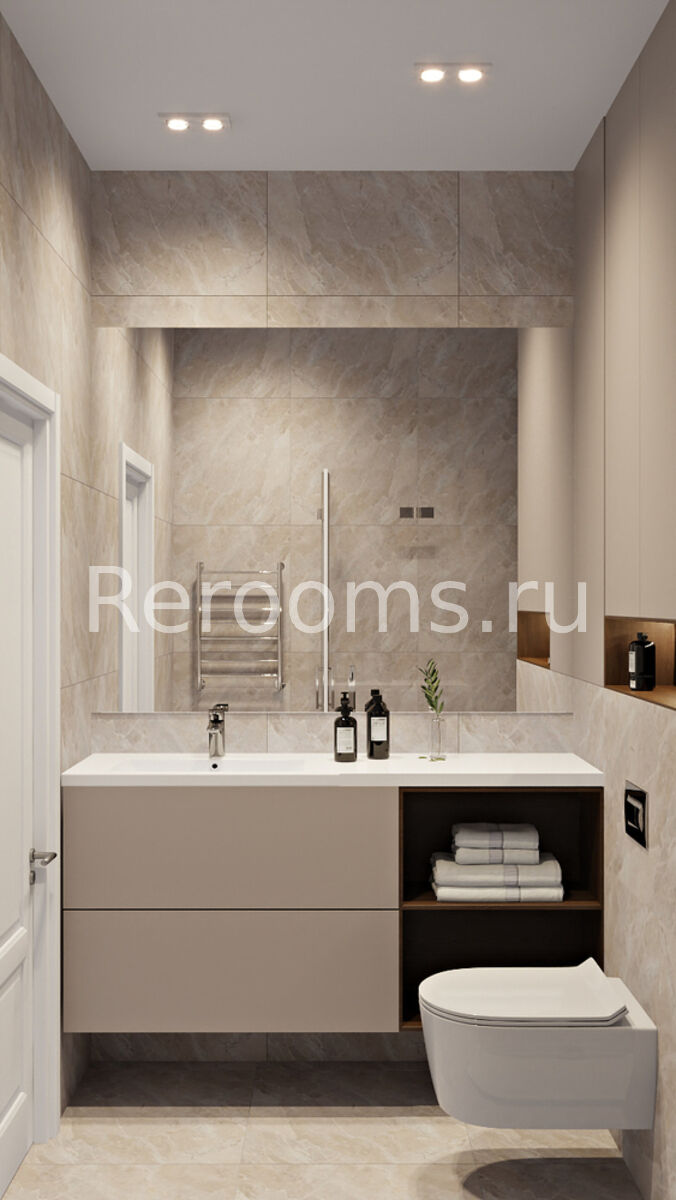 Дизайн-проект этой квартиры выполнен в стиле модернизм. Интерьер получился необычайно удобным и эргономичным. Все предметы сочетаются друг с другом и в полной мере отражают специфику стиля. Спокойная цветовая гамма с преобладанием различных оттенков бежевого создает в помещении атмосферу спокойствия и умиротворения.