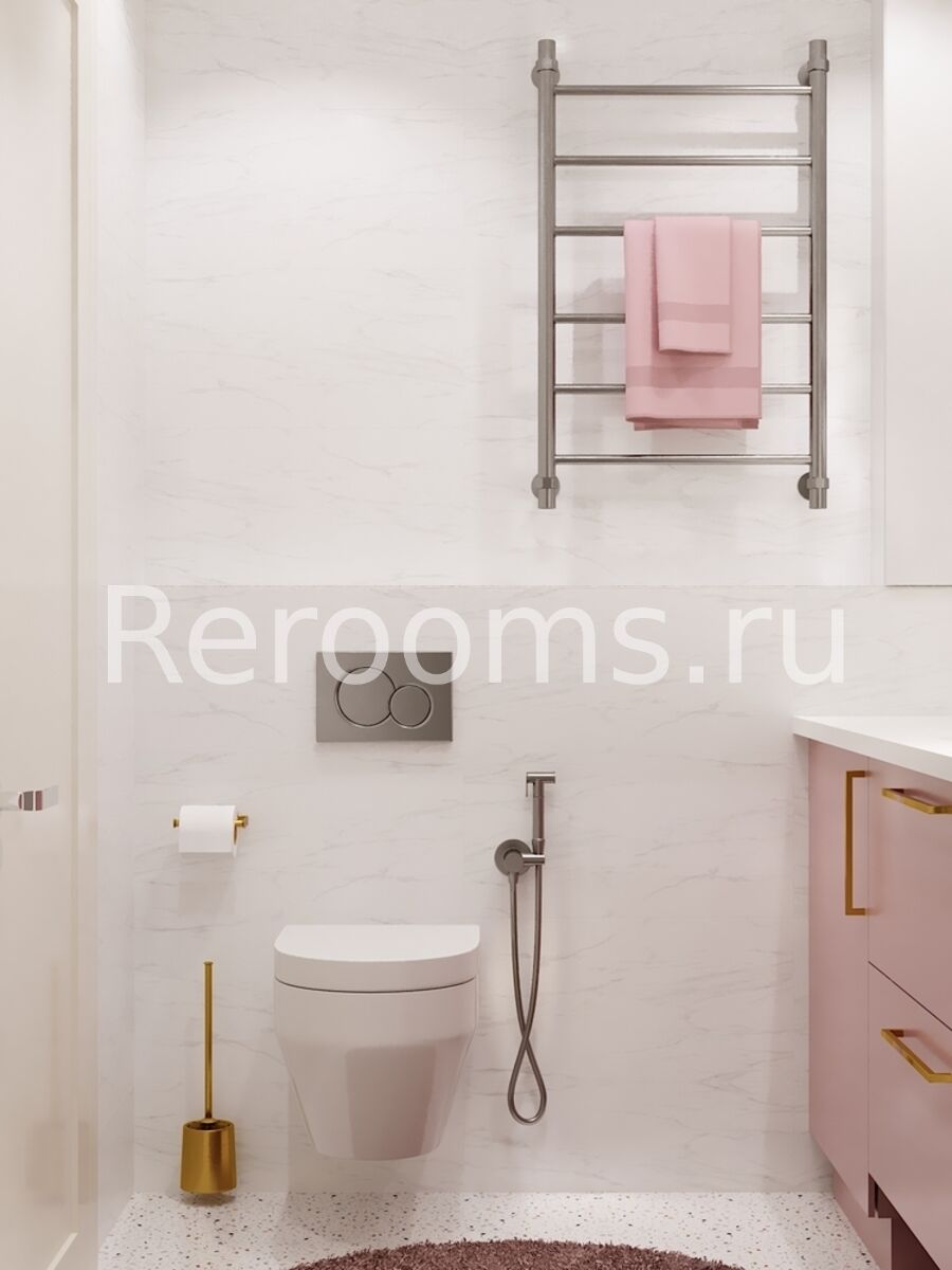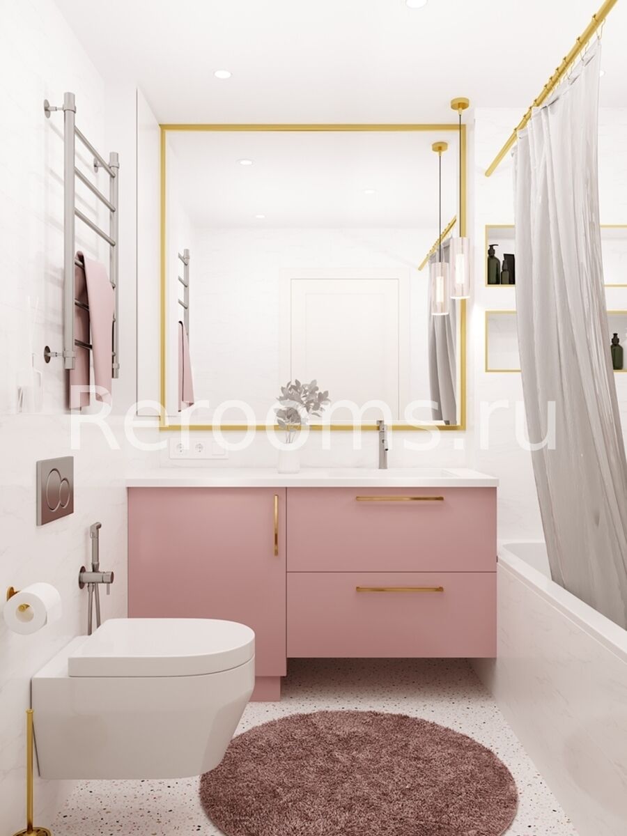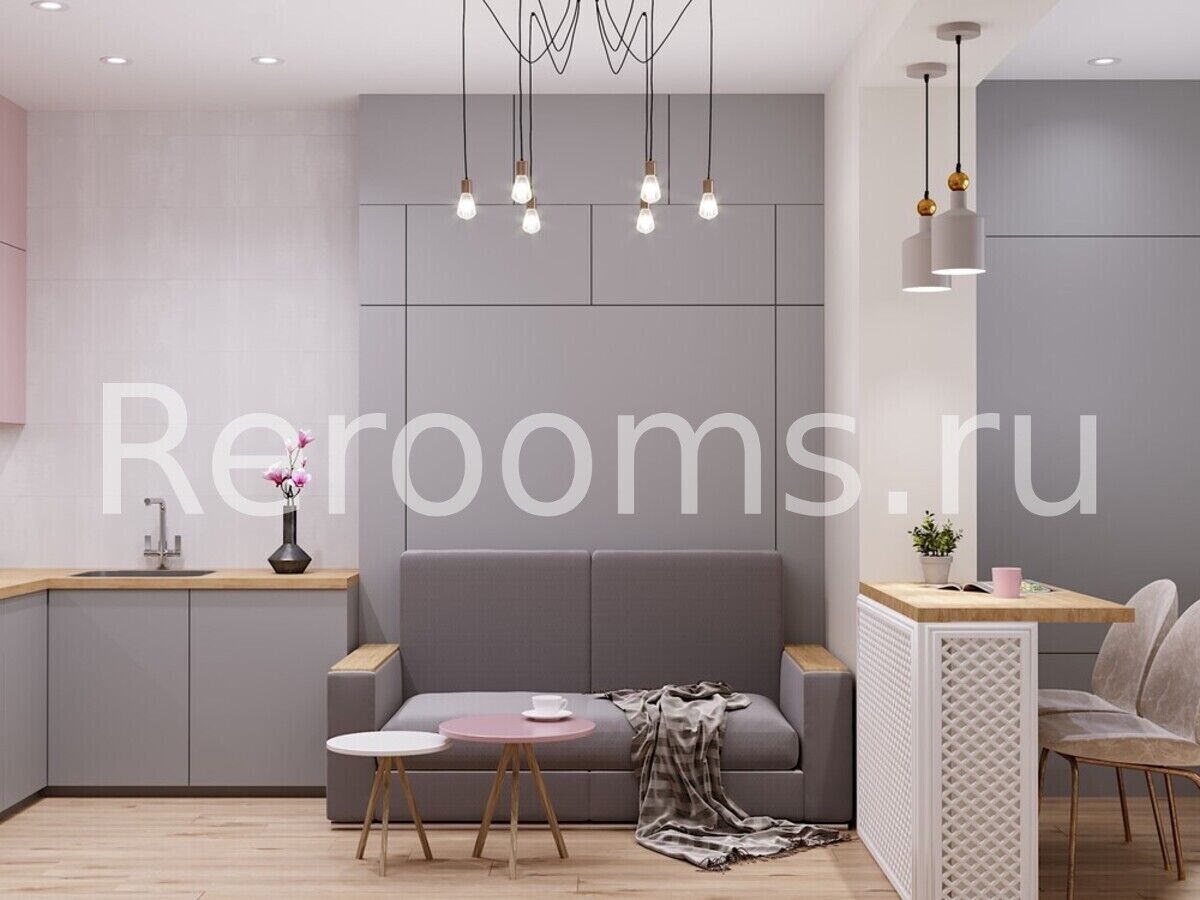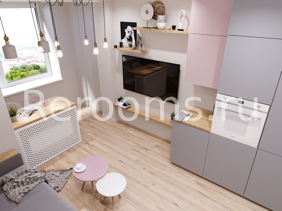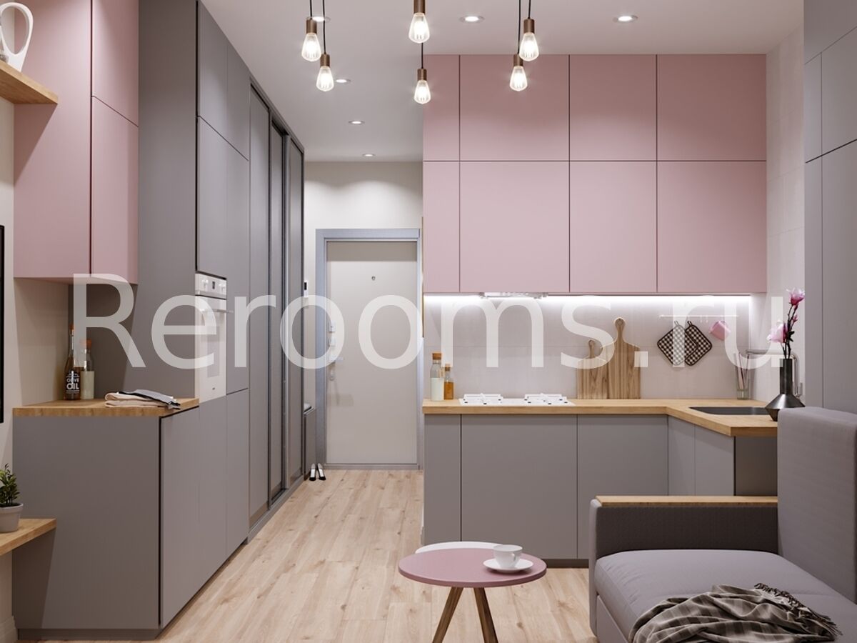 Дизайн-проект этой квартиры-студии выполнен в современном стиле. В интерьере гармонично сочетаются элементы модернизма, современной классики и арт-деко. В цветовом отношении помещение выдержано в серых и розовых тонах. Пространство визуально поделено на несколько функциональных зон - прихожей, кухни и гостиной. Балкон решено было демонтировать и оборудовать на его месте зону отдыха с барной стойкой. Общую концепцию интерьера выдержали и в ванной комнате.