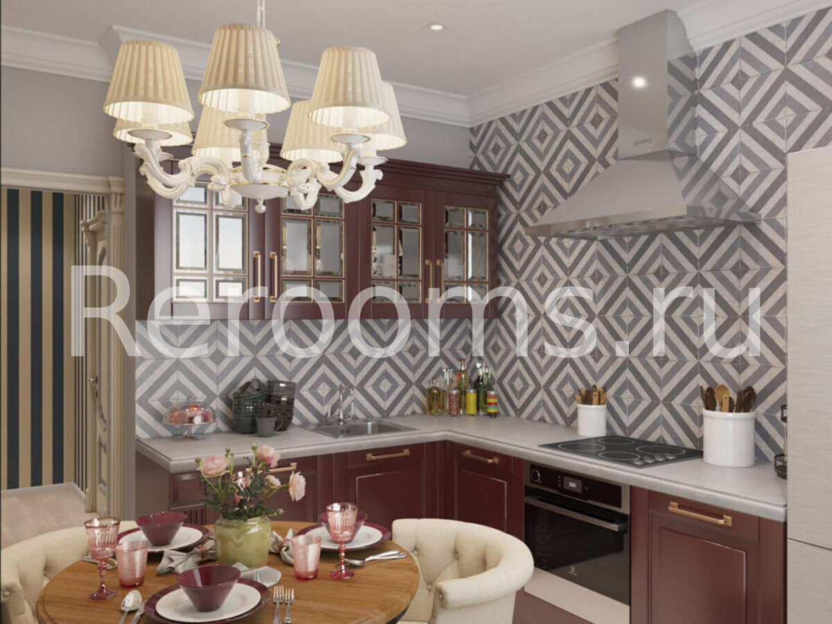В целом в квартире спокойная цветовая гамма с ярким элементами и большим количеством орнамента. Яркая вишневая кухня притягивает взгляд, но при этом обои и фартук с геометрическим орнаментом успокаивают этот «взрыв» цвета. В гостиной, которая служит еще и спальней выбраны спокойные бежевые и голубоватые оттенки.