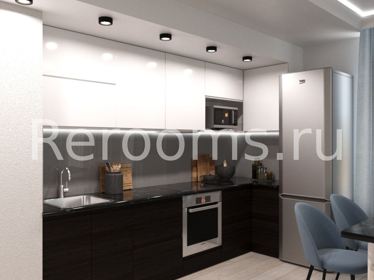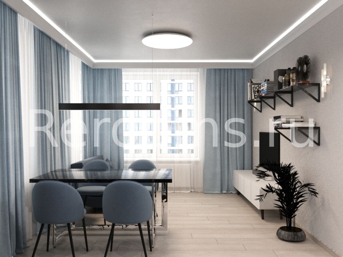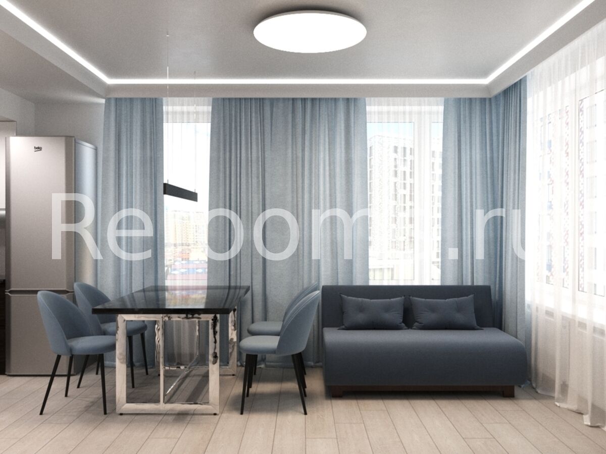 Дизайн-проект этой квартиры, выполненный в стиле модернизм, получился очень стильным и современным. В кухне-гостиной разместили компактный мебельный гарнитур со встроенной техникой, обеденную группу и обустроили лаунж-зону с диваном и телевизором. Особое внимание в интерьере уделено цвету. Красивые оттенки серого и голубого, использованные не только в кухне-гостиной, но и в спальне, и в кабинете, красиво сочетаются между собой, делая пространство необычайно цельным и уютным. Большое внимание уделено освещению. Основные источники света дополнены локальными светильниками, которые обеспечивают квартиру мягким равномерным светом.
