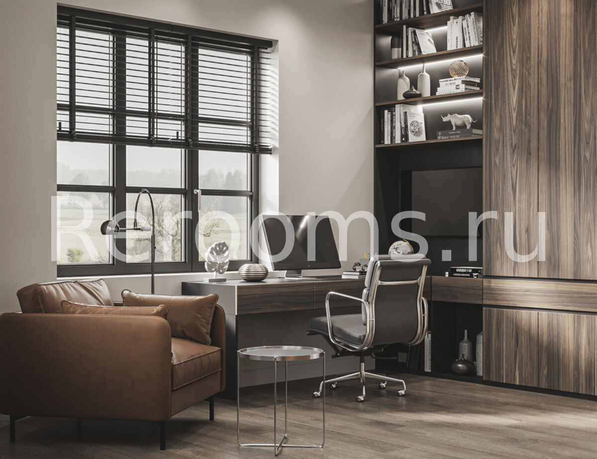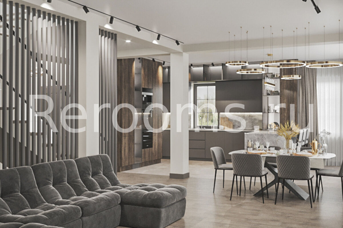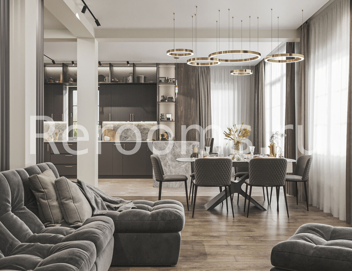 Дизайн двухэтажного дома выдержан в современном стиле. Цветовая гамма с использованием серых, бежевых, коричневых и акцентных золотых тонов делает интерьер ультрамодным и красивым. Интересная архитектура пространства, комбинация различных материалов и оригинальный световой сценарий - все это работает на поддержание концепции современного дизайна.