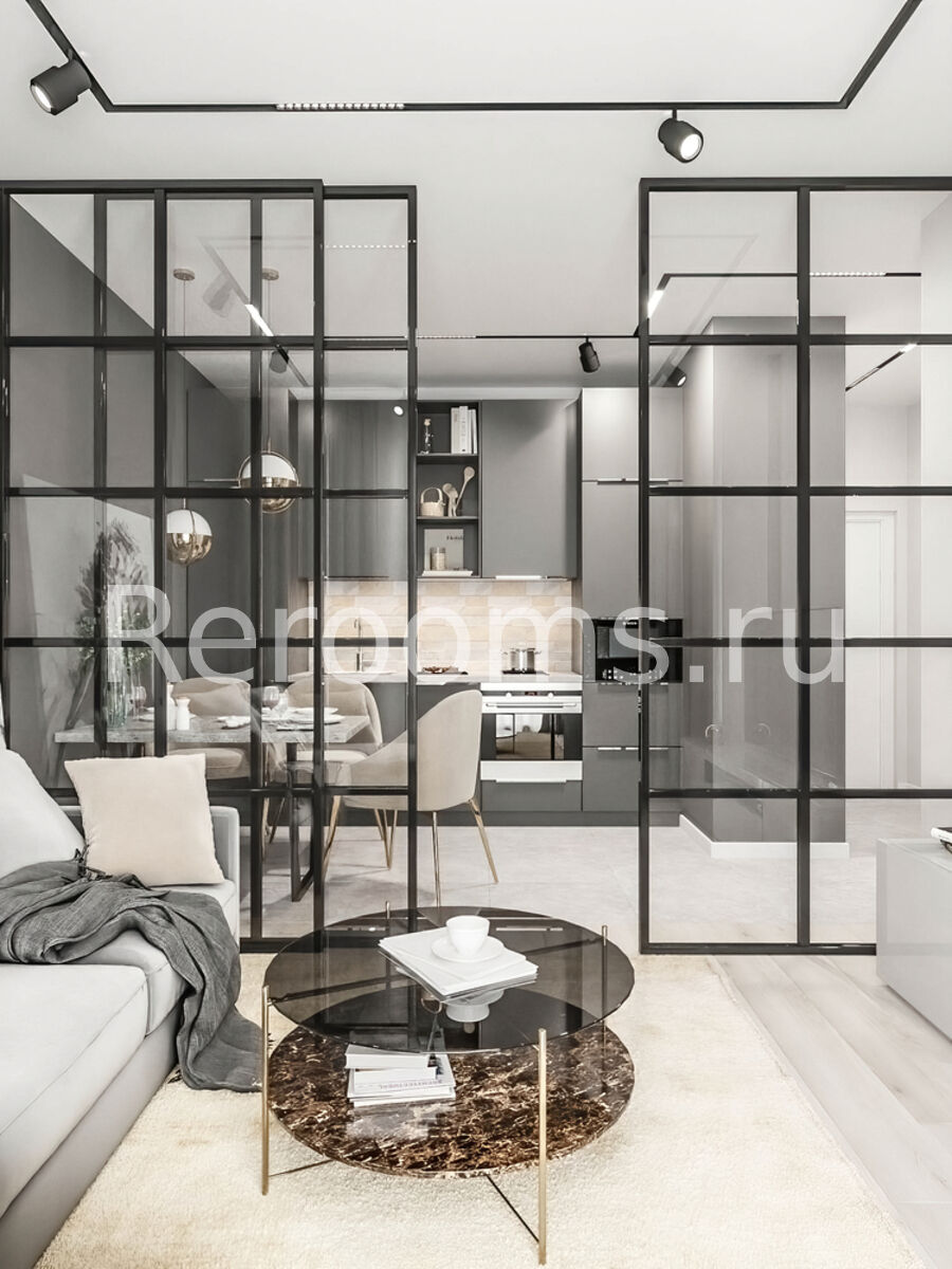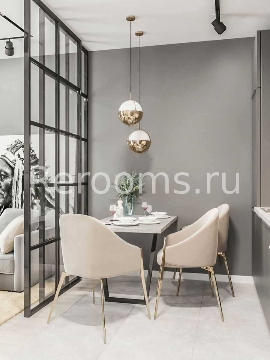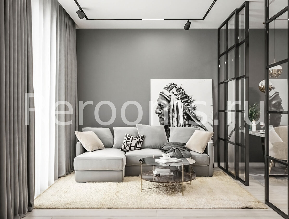 Дизайн-проект двухкомнатной квартиры выполнен в стиле модернизм. Интерьер решен в красивой цветовой гамме. Здесь преобладают различные оттенки серого и пыльно-розового цветов. В качестве перегородки между кухней и гостиной дизайнер использовала стекло с металлическим каркасом. Такой прием прием придал помещению ультрасовременный вид. Особое внимание в квартире уделено освещению.Трековая система здесь дополнена изящными светильниками.