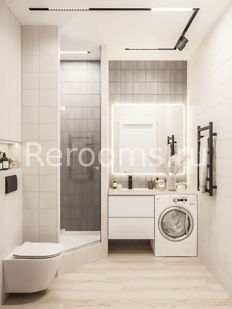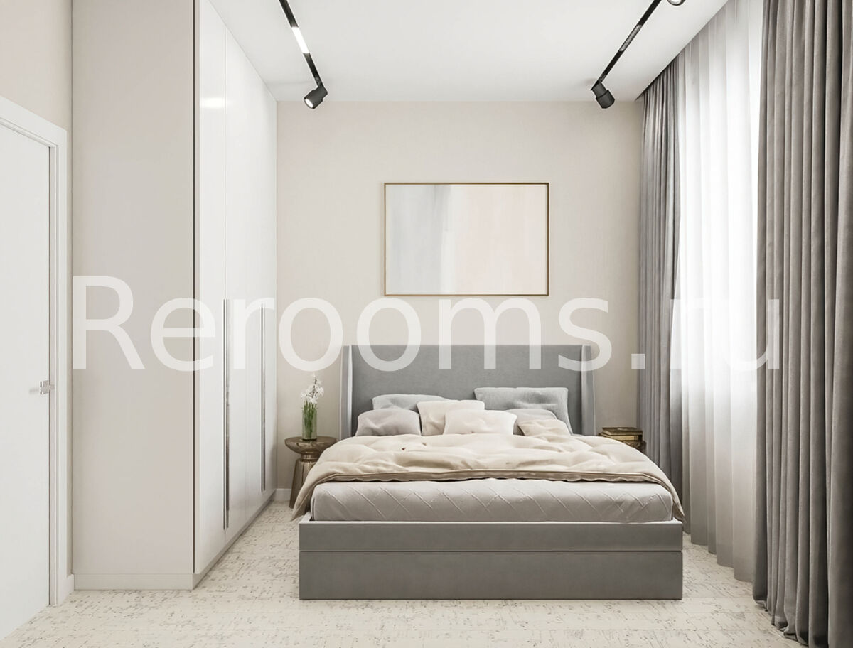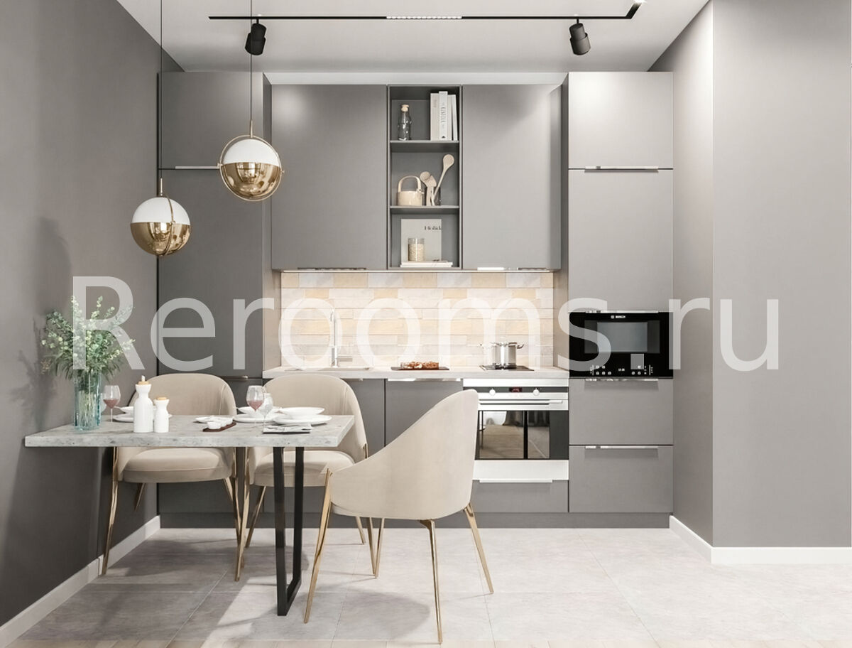 Дизайн-проект двухкомнатной квартиры выполнен в стиле модернизм. Интерьер решен в красивой цветовой гамме. Здесь преобладают различные оттенки серого и пыльно-розового цветов. В качестве перегородки между кухней и гостиной дизайнер использовала стекло с металлическим каркасом. Такой прием прием придал помещению ультрасовременный вид. Особое внимание в квартире уделено освещению.Трековая система здесь дополнена изящными светильниками.