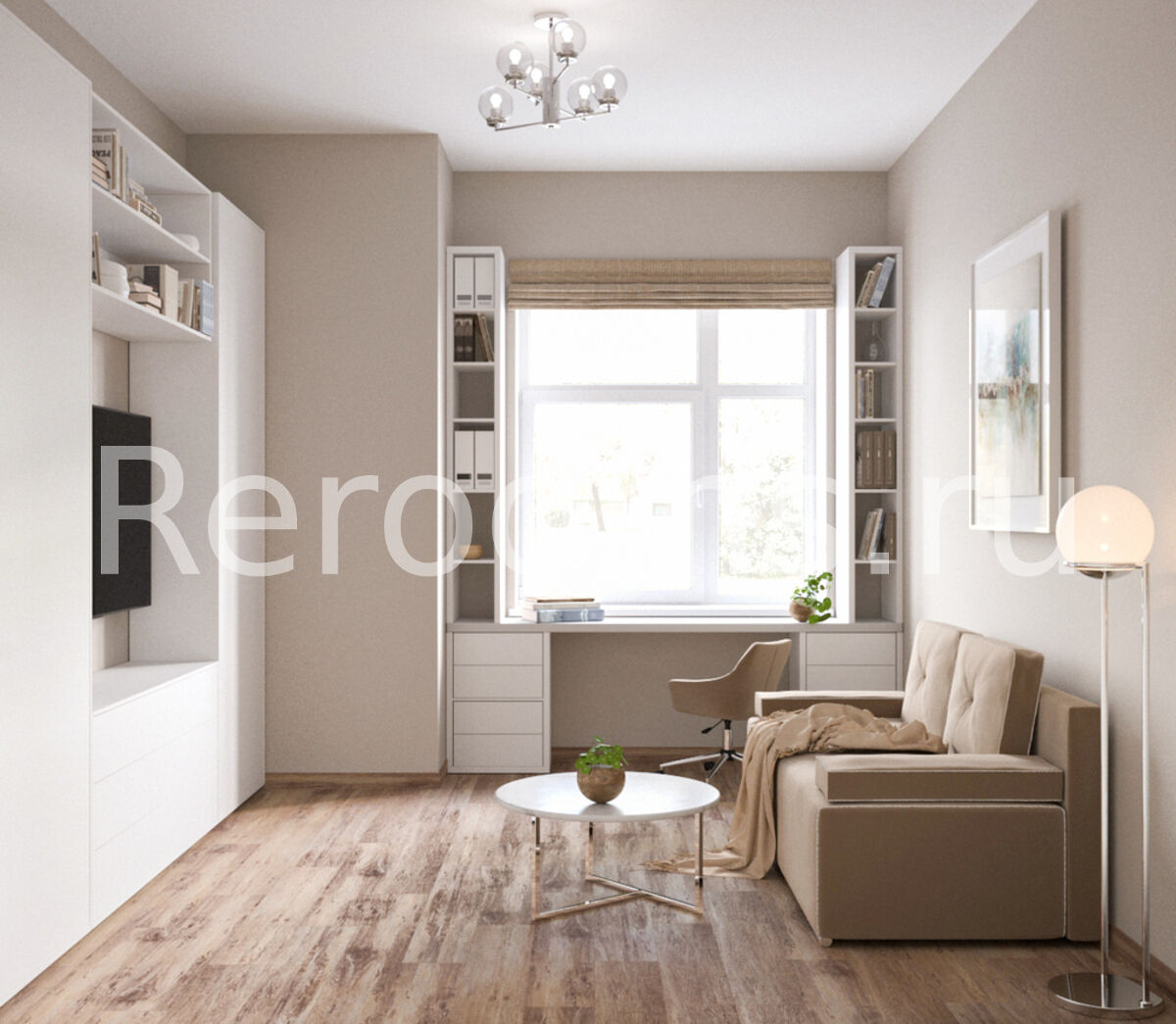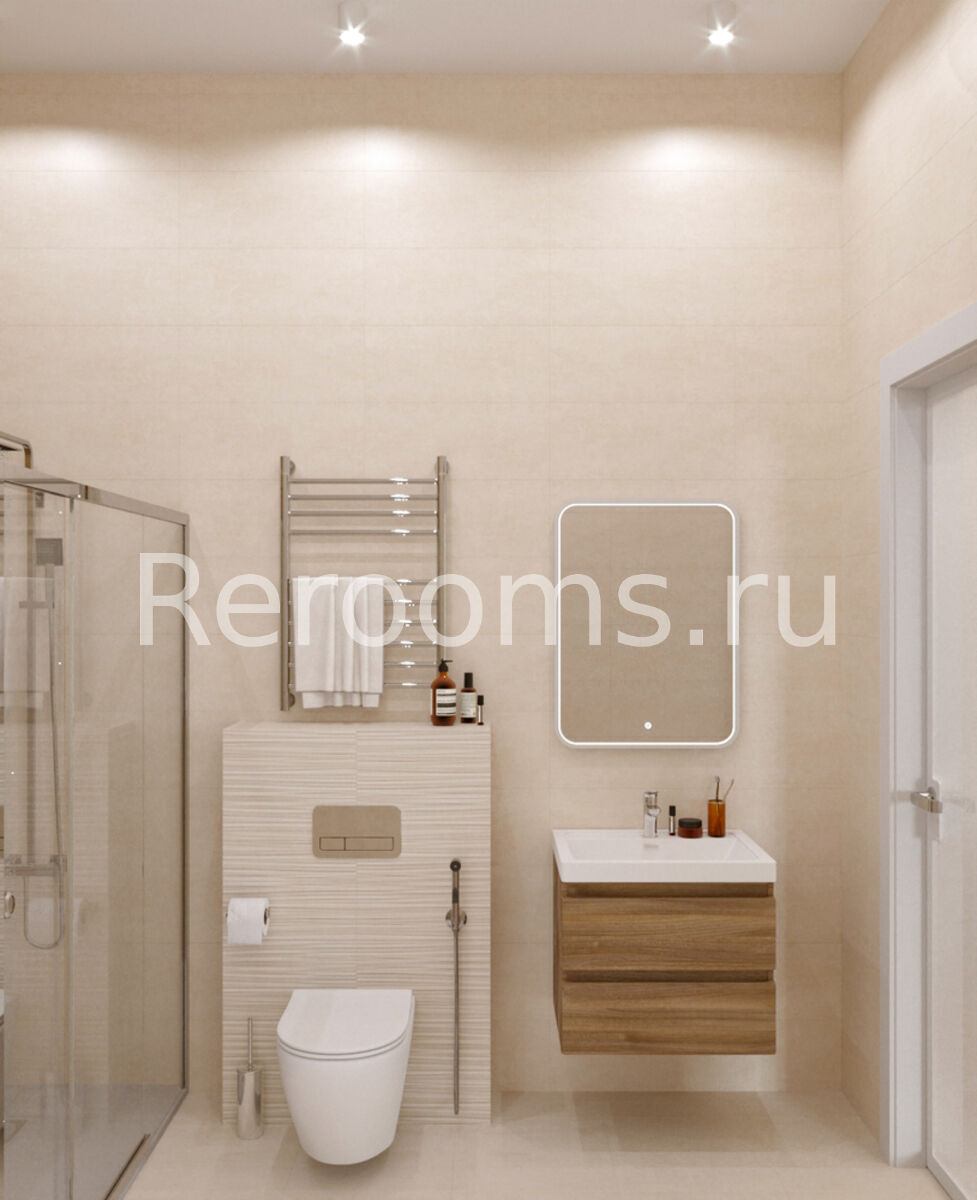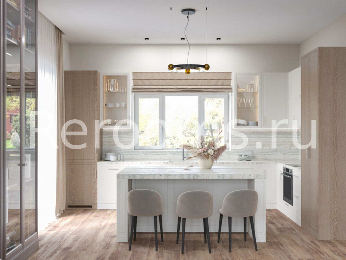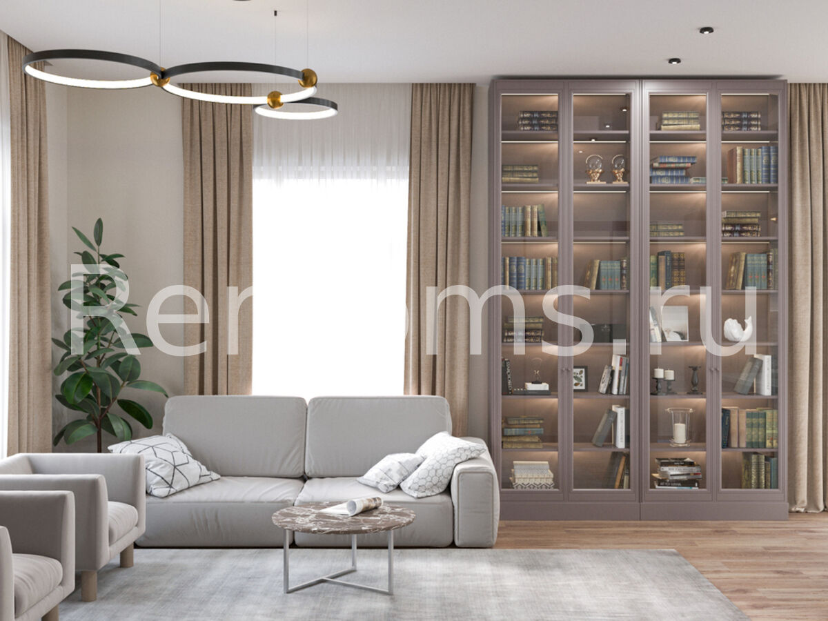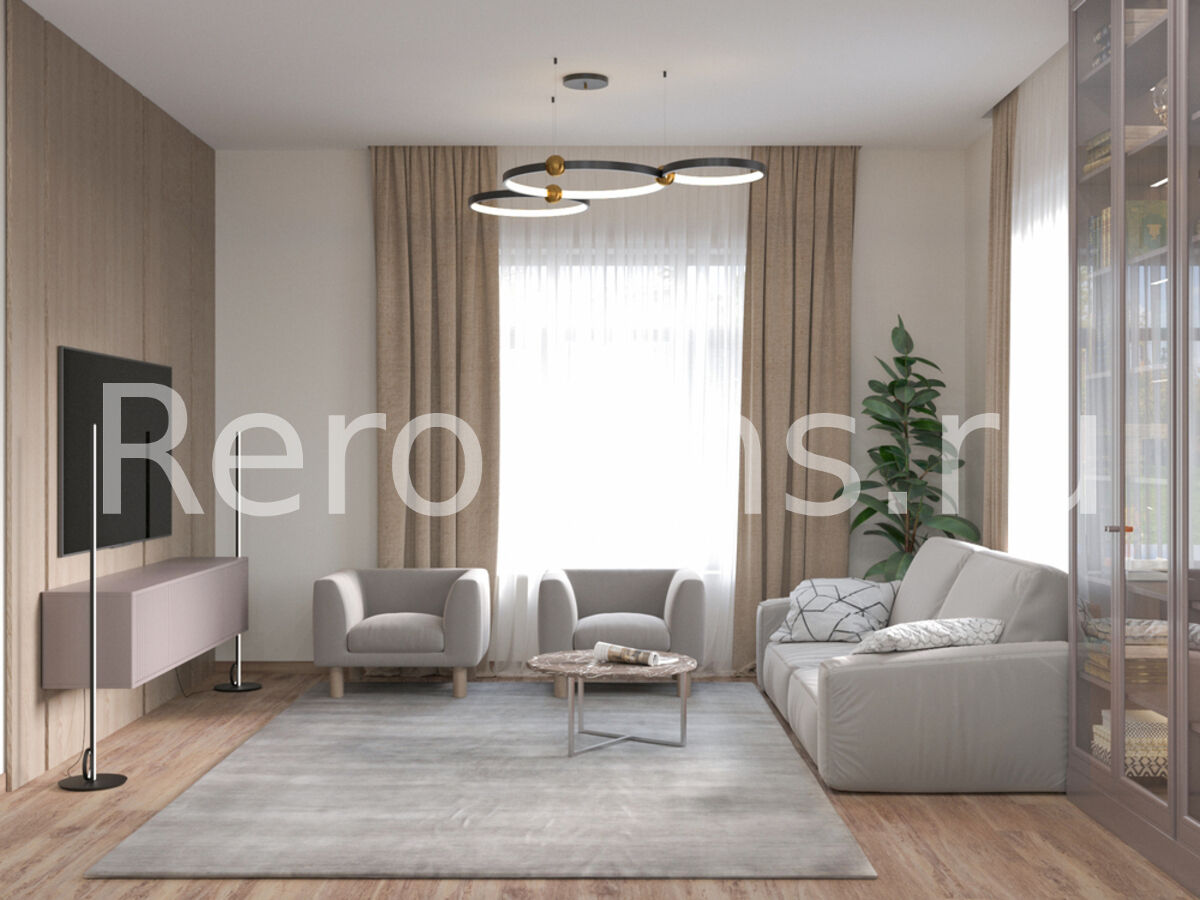 Дизайн-проект этажа таунхауса выполнен в стиле модернизм. Во главу угла дизайнер поставила понятия многофункциональности и комфорта. В результате интерьер получился необычайно удобным и эргономичным. Все предметы сочетаются друг с другом и в полной мере отражают специфику стиля. Спокойная цветовая гамма с преобладанием бежевого и серого создает в помещении атмосферу спокойствия и умиротворения.