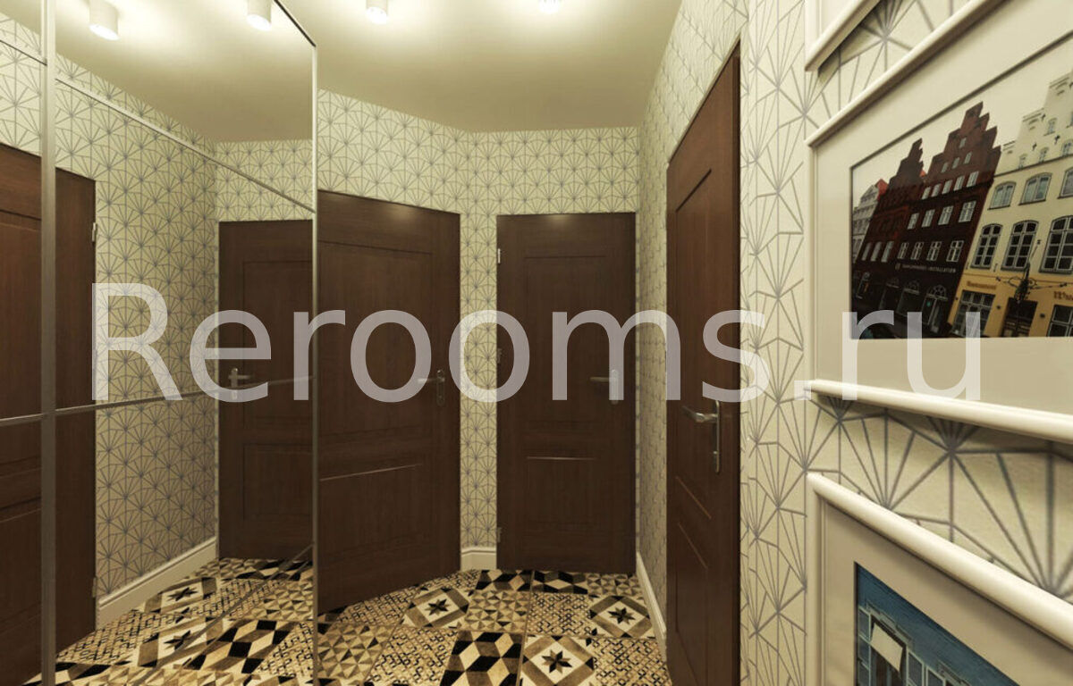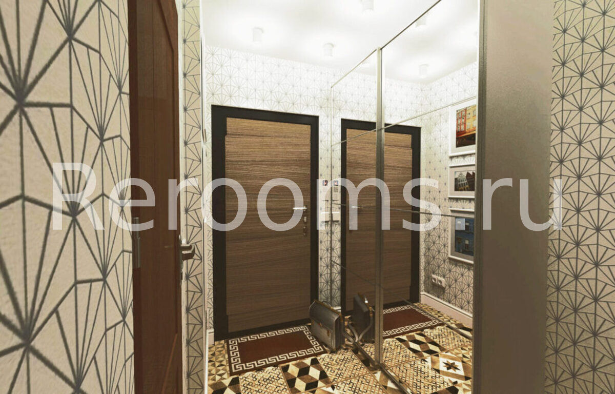 Стены и мебель выполнены в светлых тонах с целью визуального расширения пространства. В прихожей расположен вместительный шкаф-купе с зеркальными дверцами, которые расширяют пространство.