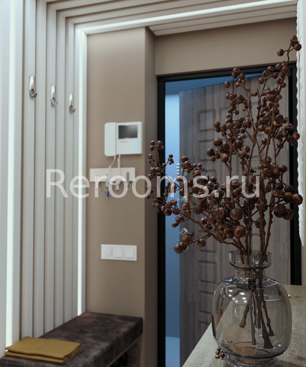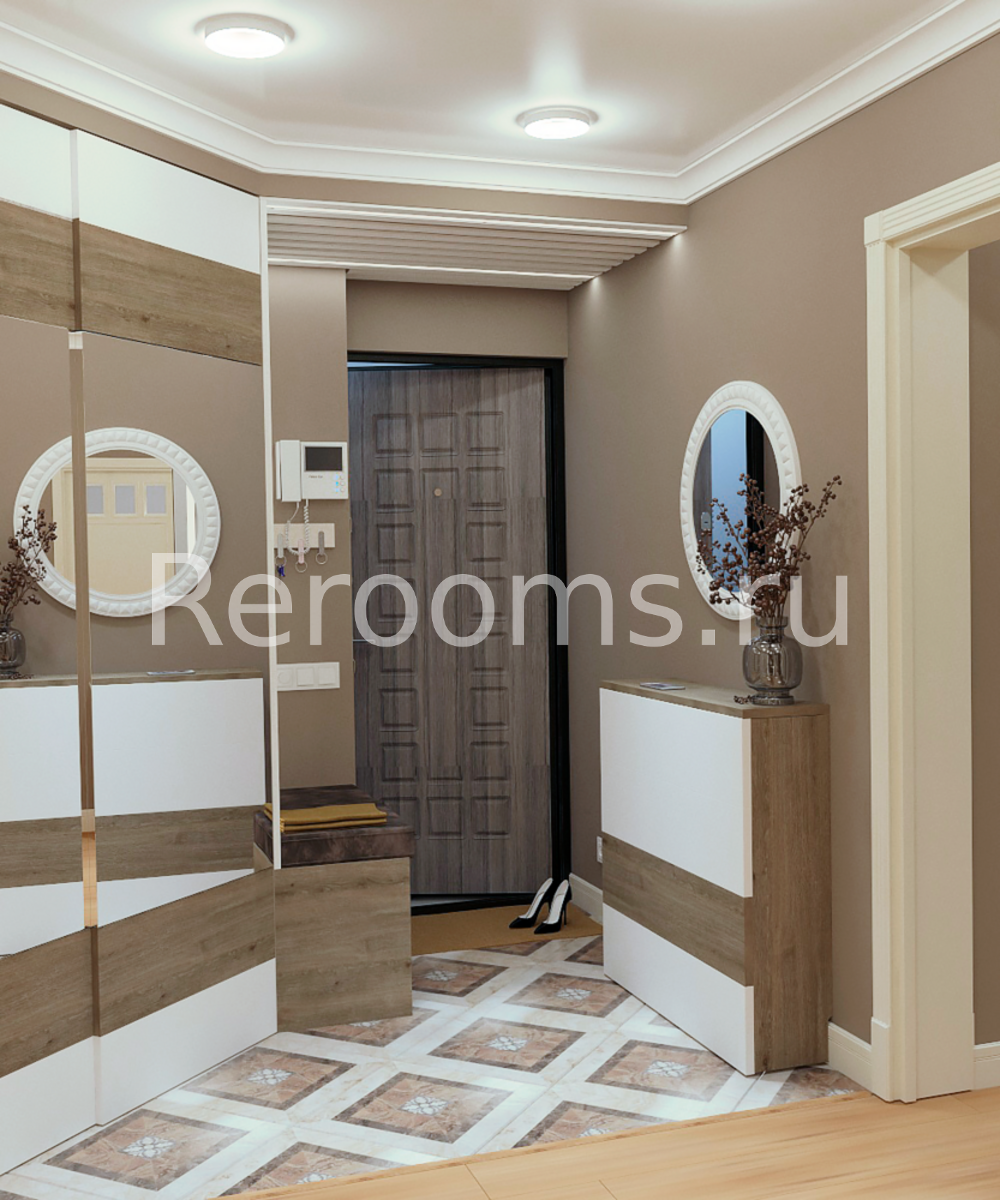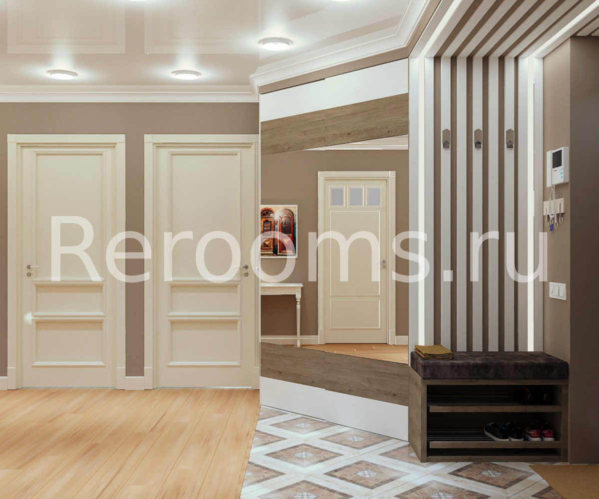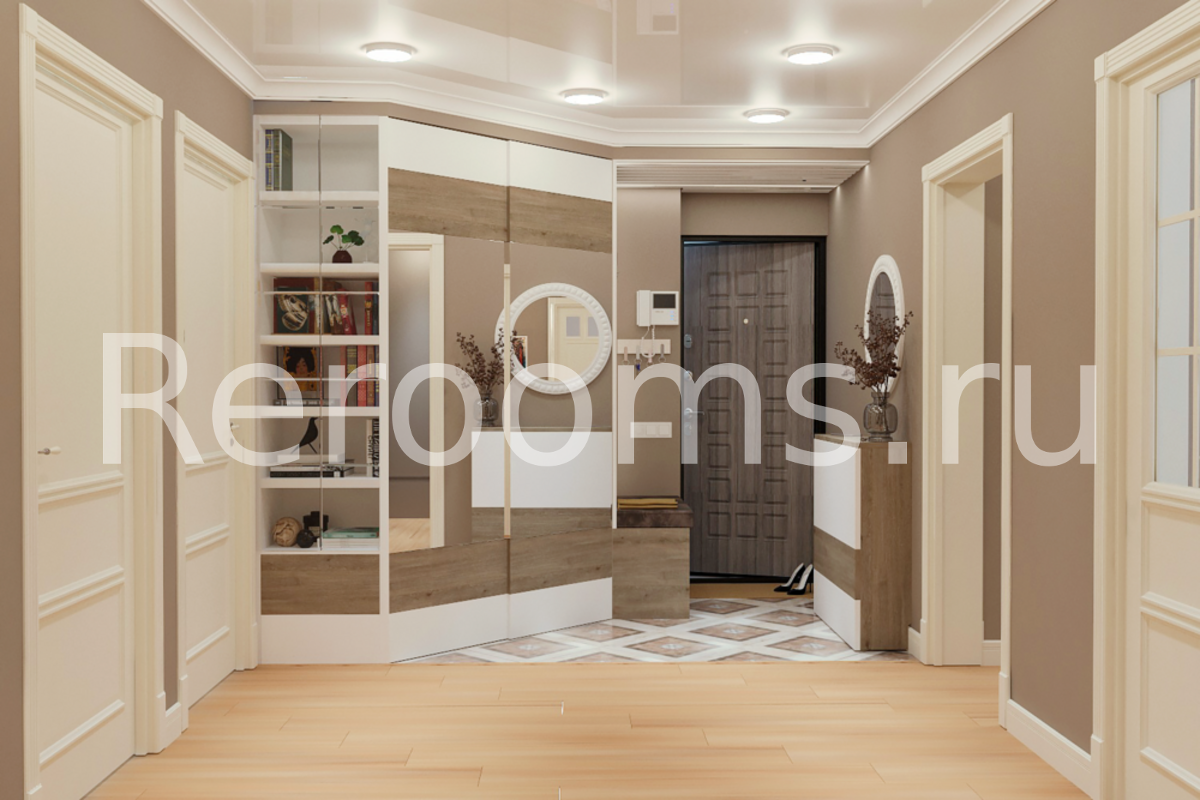 Дизайн-проект этой прихожей выполнен в классическом стиле. Интерьер получился очень элегантным и утонченным. Красивая бежево-коричневая цветовая гамма, изящная классическая мебель в ансамбле с нарядным декором создают в помещении неповторимую атмосферу изысканности и гармонии.