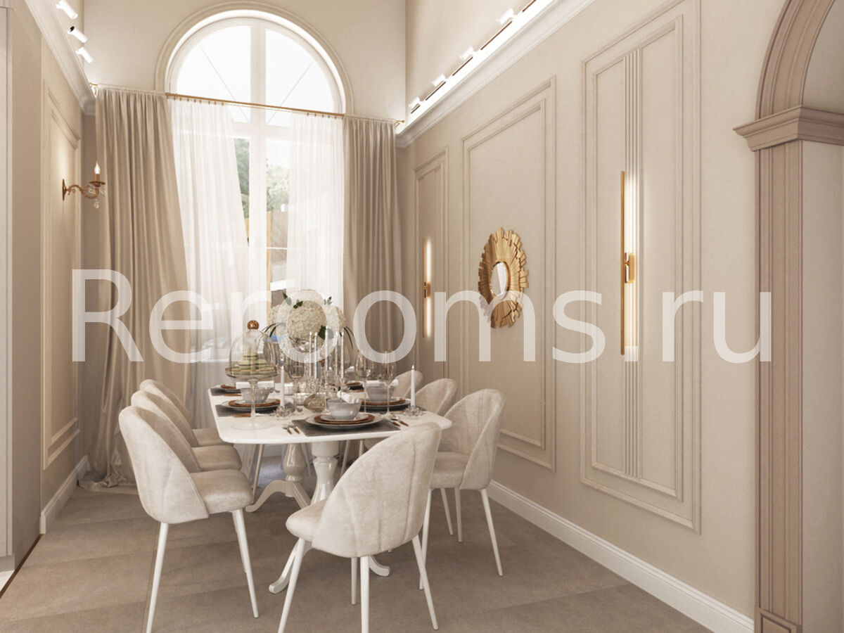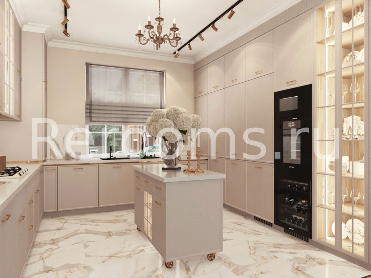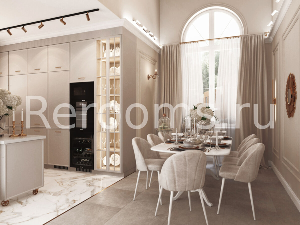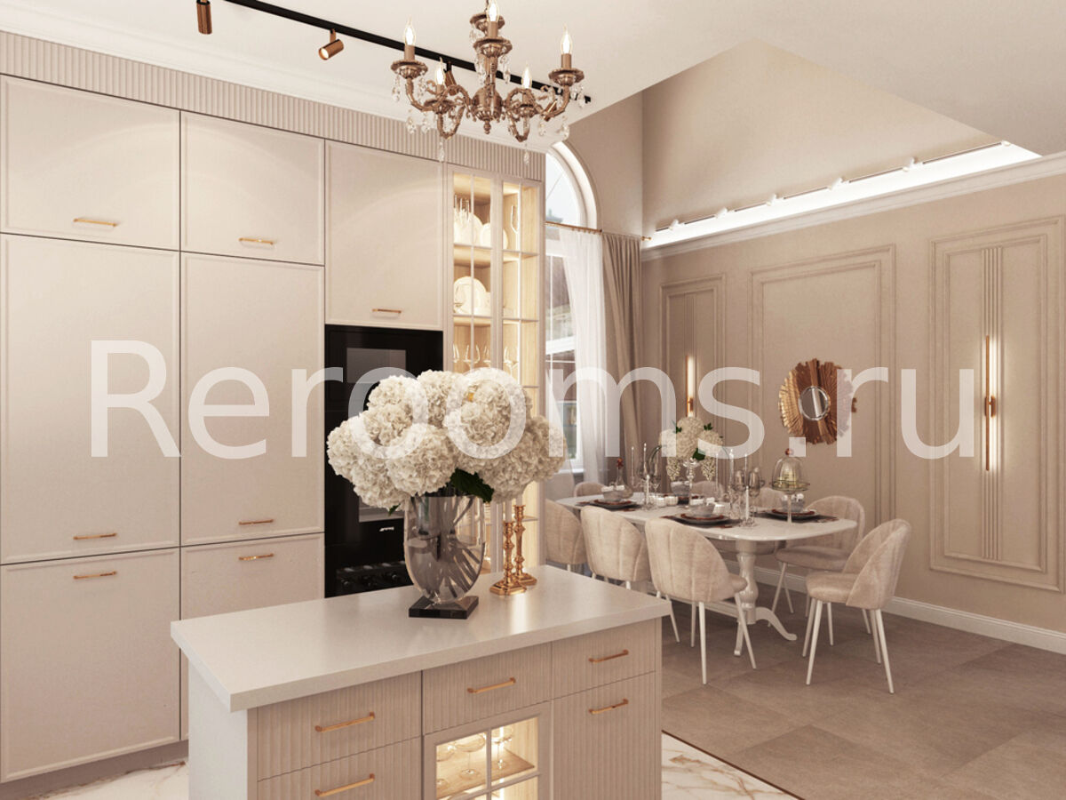 Дизайн-проект для кухни и столовой в частном доме выполнен в стиле современная классика. Интерьер отличается изяществом и функционализмом. Здесь все продумано до мелочей. Цвет, отделка, композиция, а также разнообразные приемы декорирования создают в квартире неповторимую атмосферу респектабельности и уюта.