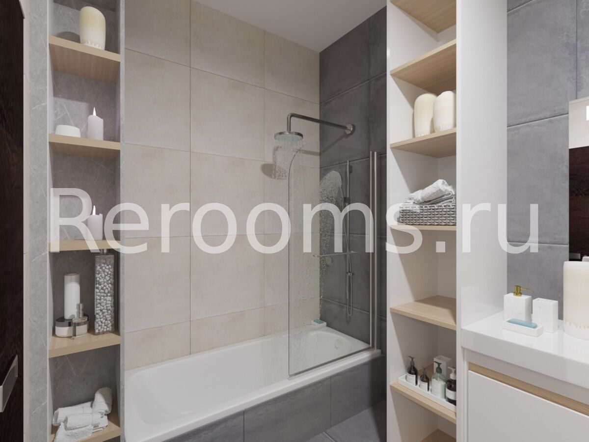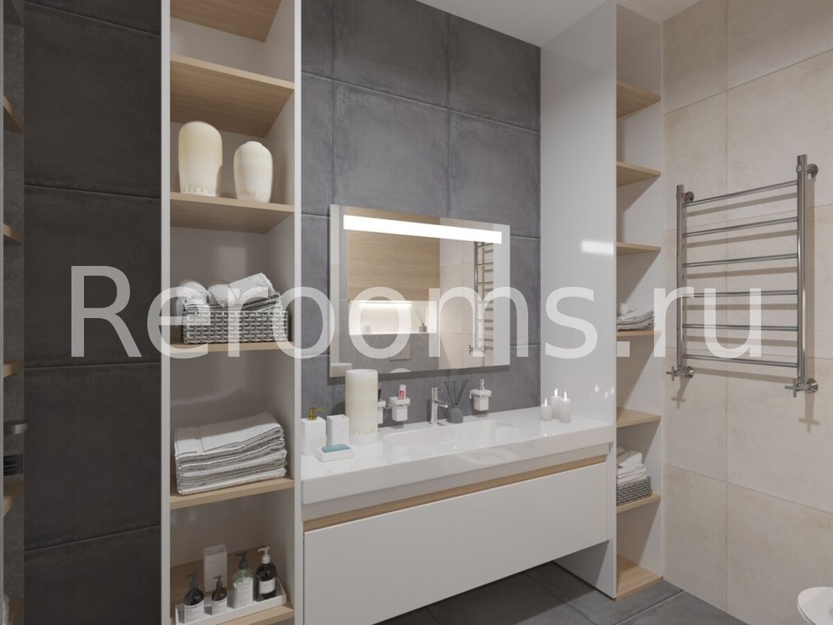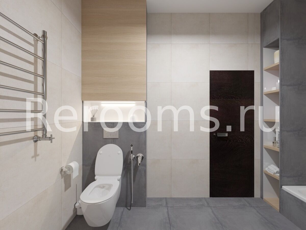 Дизайн-проект этого совмещенного санузла выполнен в современном стиле модернизм и отличается удобством и эстетическим внешним видом. Комбинация деревянных текстур с поверхностями, выполненными под камень, идеально сочетаются в этом интерьере. Сантехника и элементы декора точно вписаны в пространство ванной и формируют в ней гармоничный ансамбль