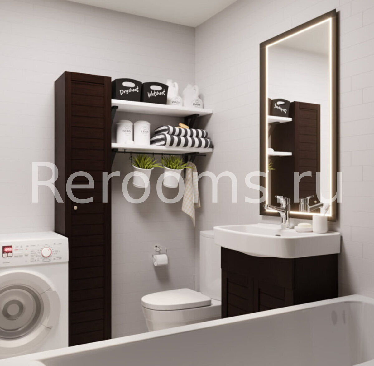 Скандинавский стиль является спокойным, дружелюбным и довольно расслабляющим. Вот почему он идеально подходит для оформления этого помещения. Ведь именно здесь мы пытаемся создать уголок для отдыха и релаксации после долгого рабочего дня, здесь мы освобождаем голову от ненужных мыслей и заряжаемся позитивом. Комната получилась очень уютной, а темные оттенки обеспечивают необходимый визуальный контраст с белой сантехникой.