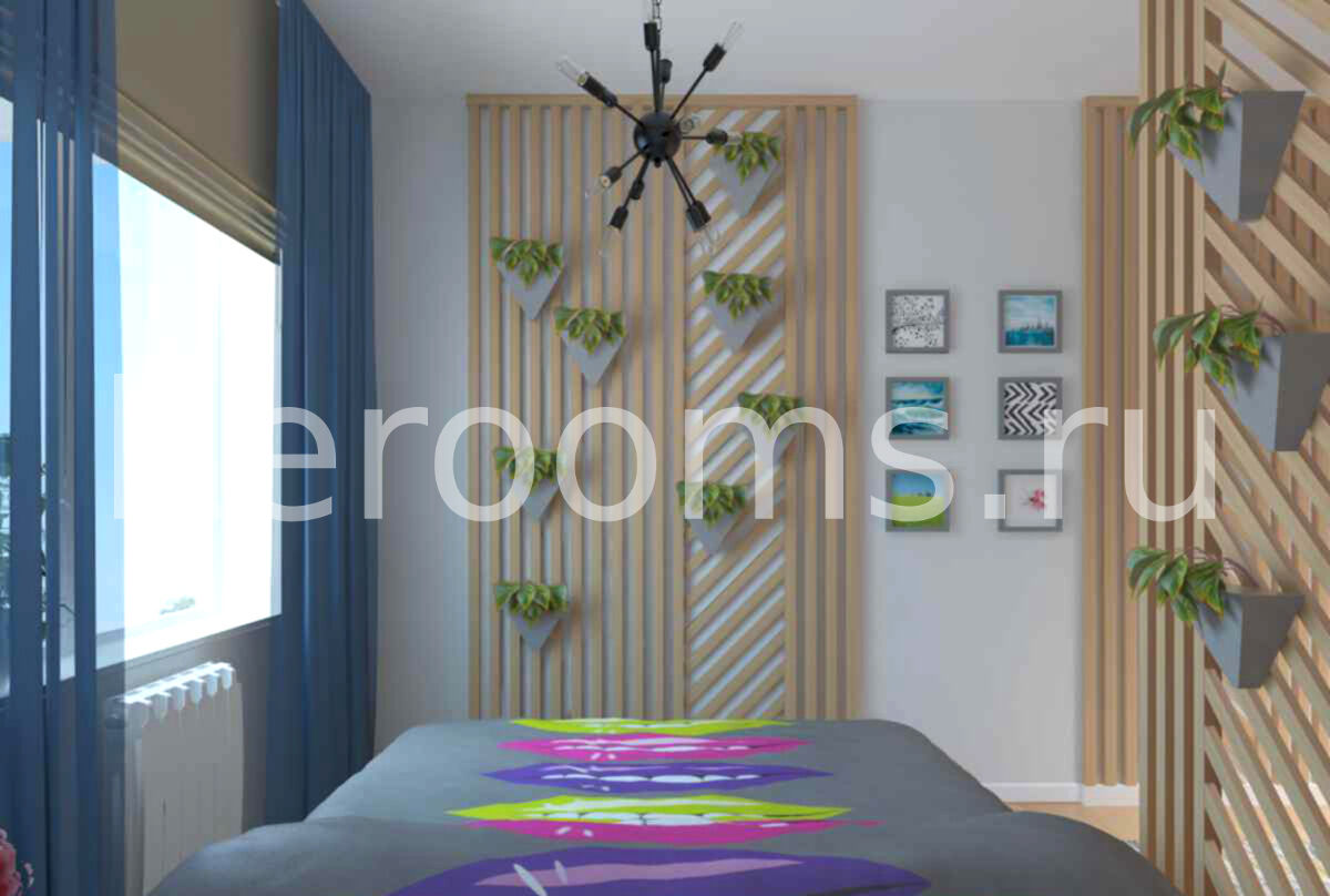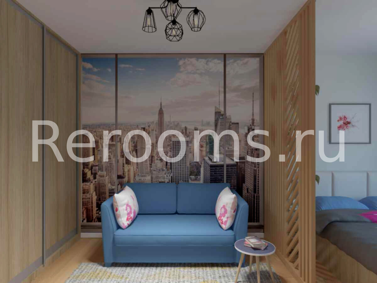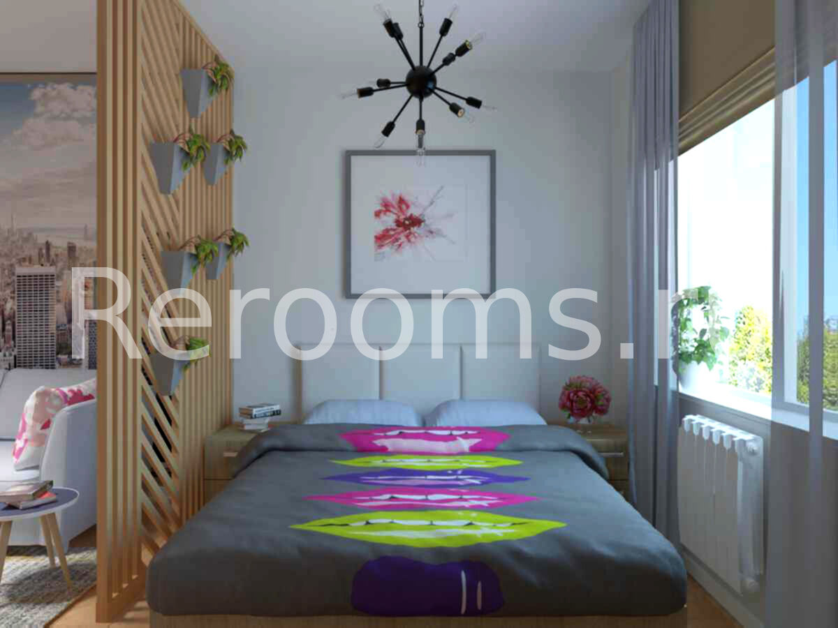 Интерьер помещения, совмещающего в себе спальню и гостиную зоны, выполнен в скандинавском стиле. Планировка, цветовое решение, отделочные материалы идеально соответствуют выбранной концепции. Не смотря на многофункциональность, комната получилась очень цельной и гармоничной.