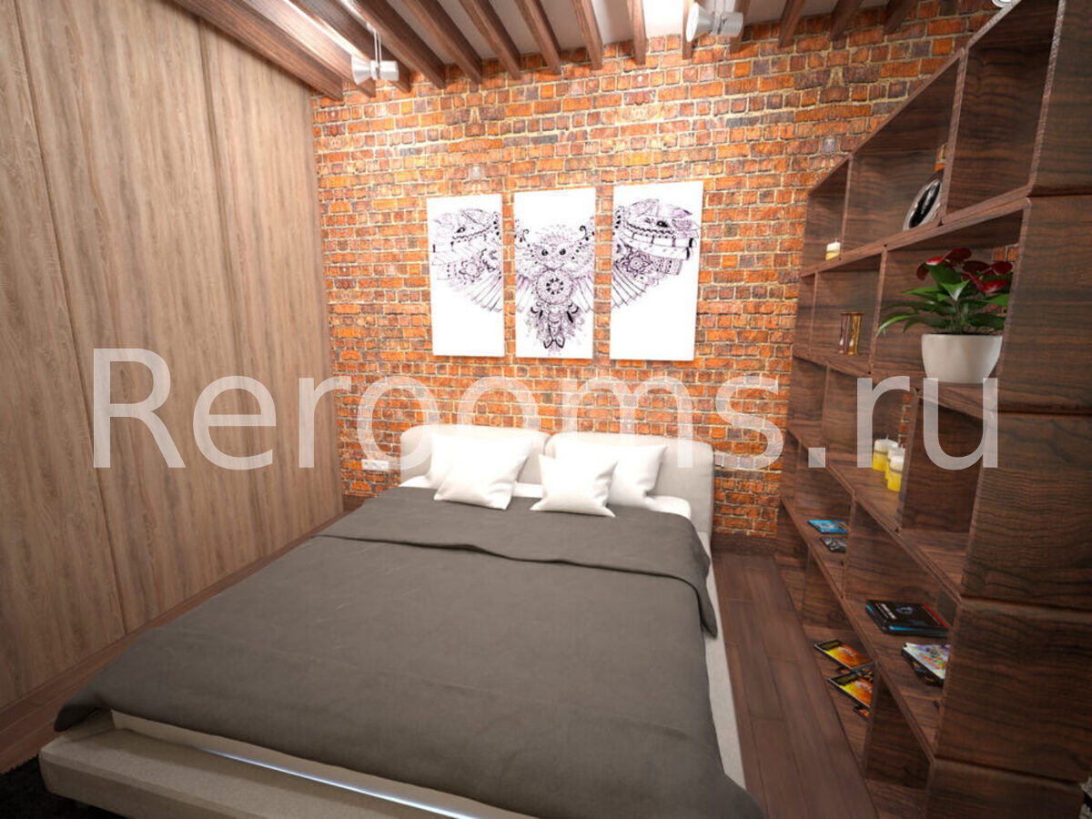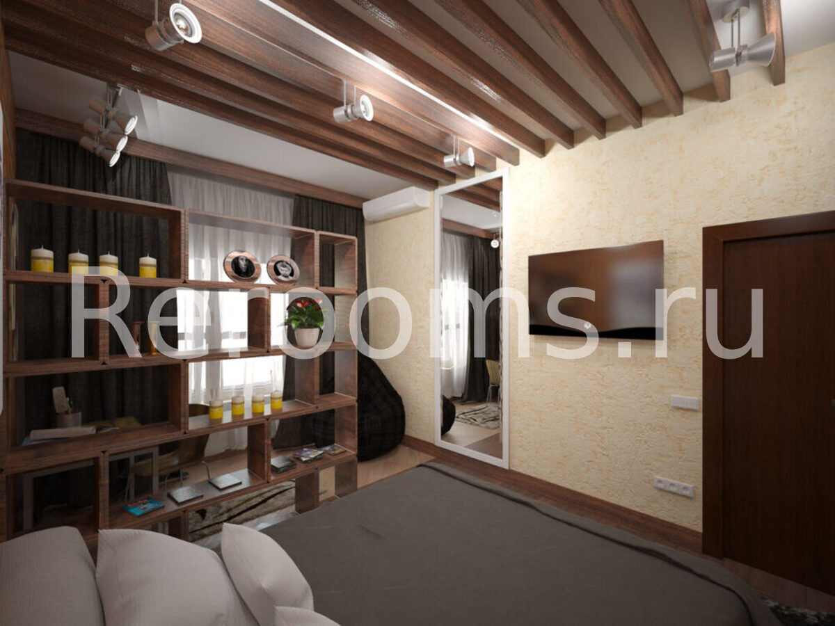 Спальня разделена стеллажом на 2 зоны - зона сна и рабочая зона. Также разделение подчеркивается типом напольного покрытия - в рабочей зоне бежевый ламинат уложен под углом 45°, а в зоне сна темный ламинат уложен строго горизонтально. Над кроватью потолок декорируется специальными балками под дерево, что создает одновременно строгость и уют пространства. Отделка стен спальни выполняется облицовочным камнем на одной стене и флизелиновыми желтыми обоями под штукатурку на остальных стенах.