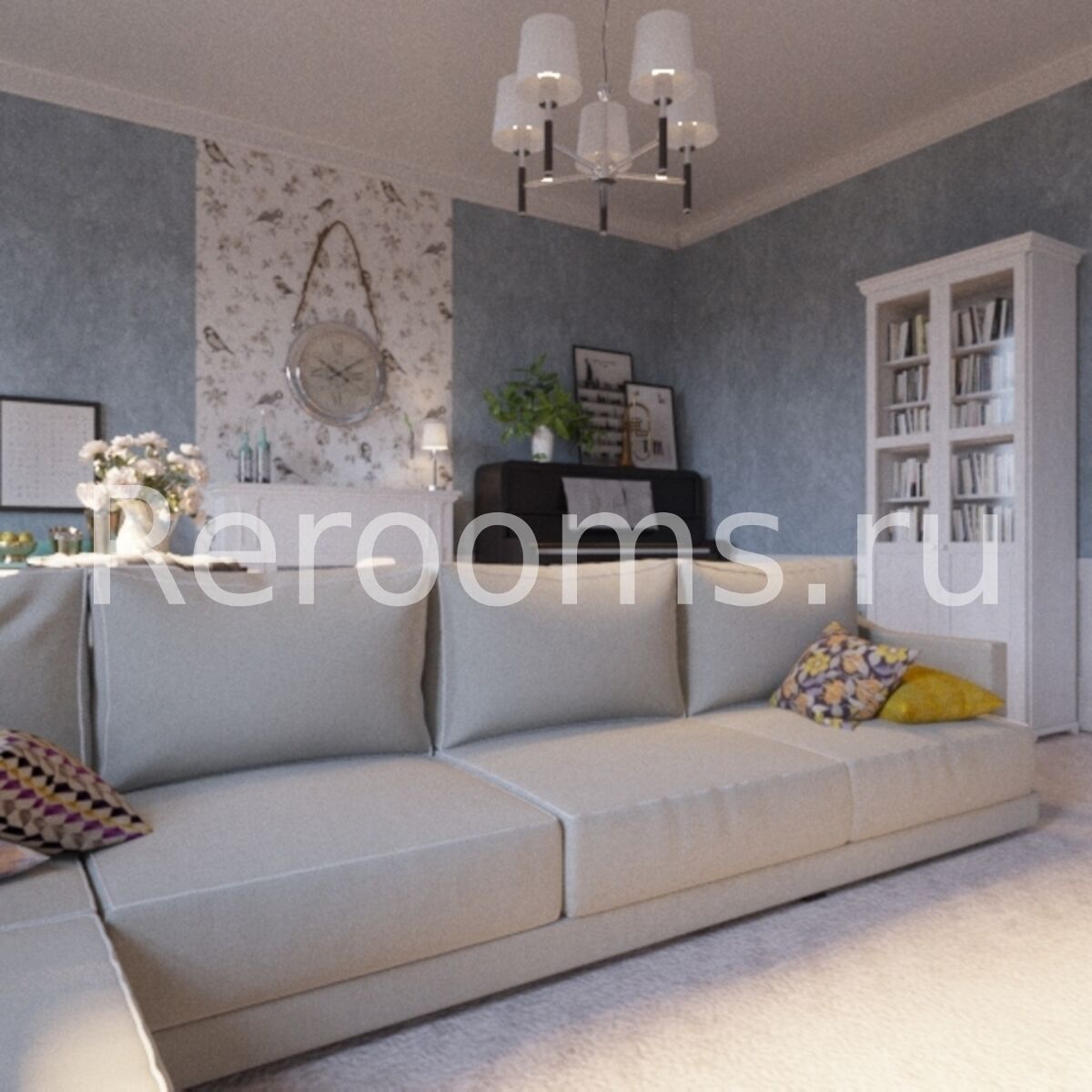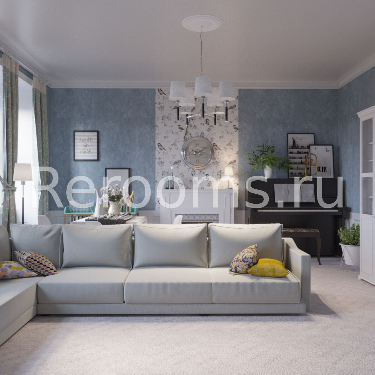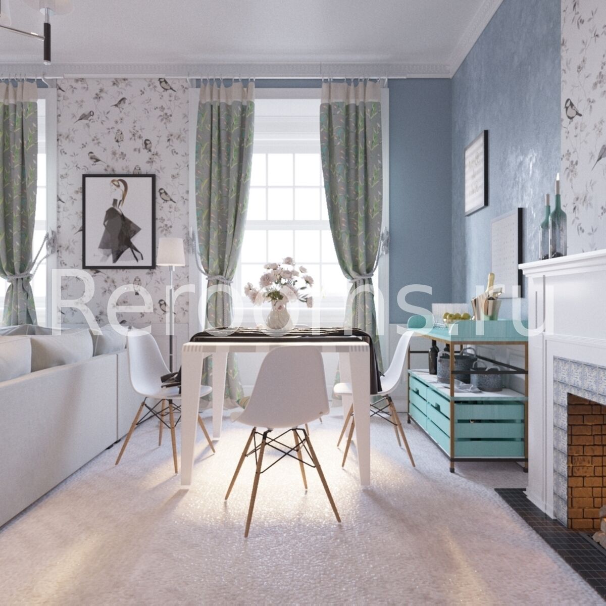 Главный декоративный элемент комнаты - камин. Изящество его форм подчеркивают контрастные обои с изысканным принтом. Определенный шарм помещению придают два окна, декорированные на французский лад.