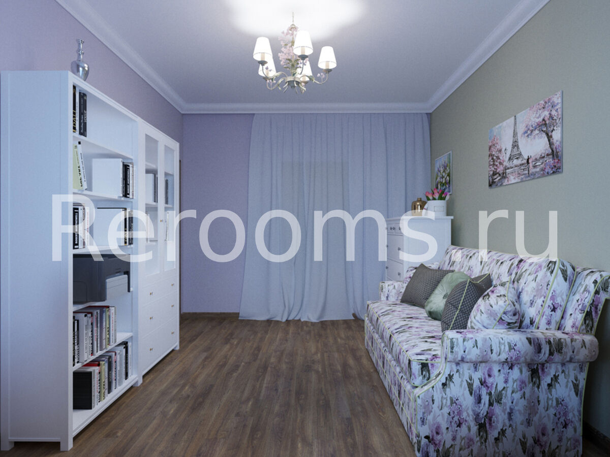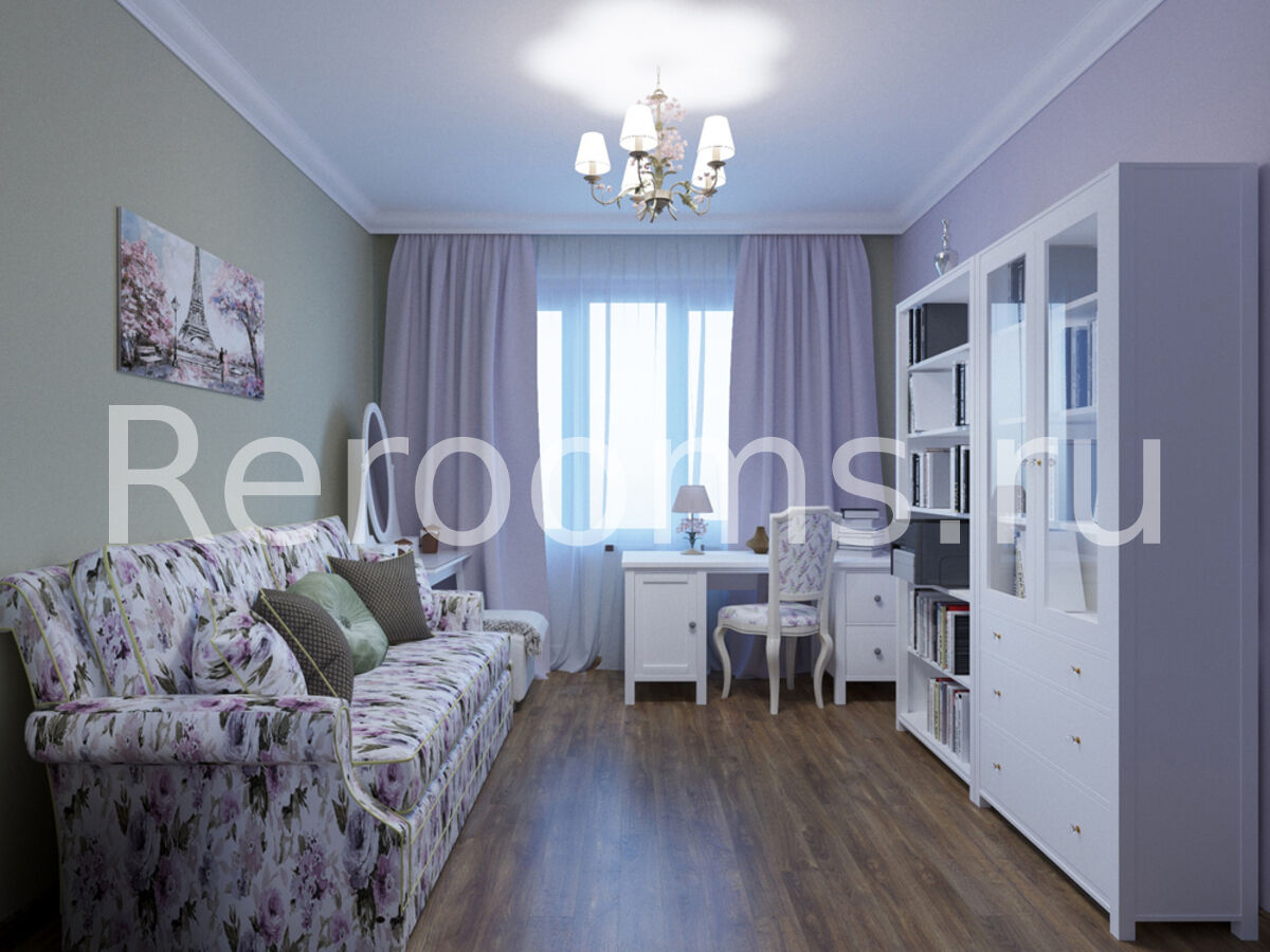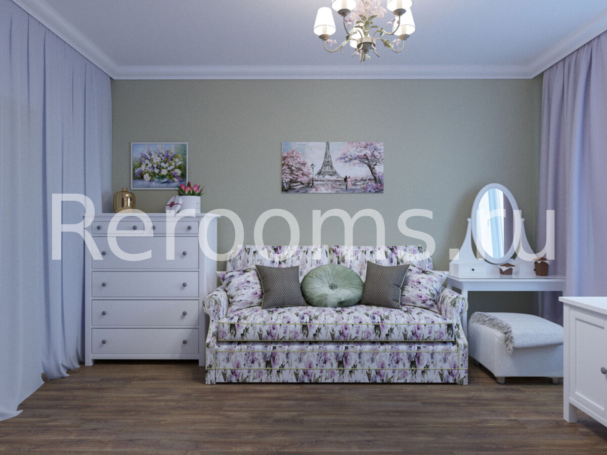 Обстановка комнаты отличается гармонией и изяществом. В центре композиции - диван с цветочным принтом, характерным для стиля прованс. Определенный шарм помещению придает изысканная деревянная мебель, которая подчеркивает французский характер помещения.