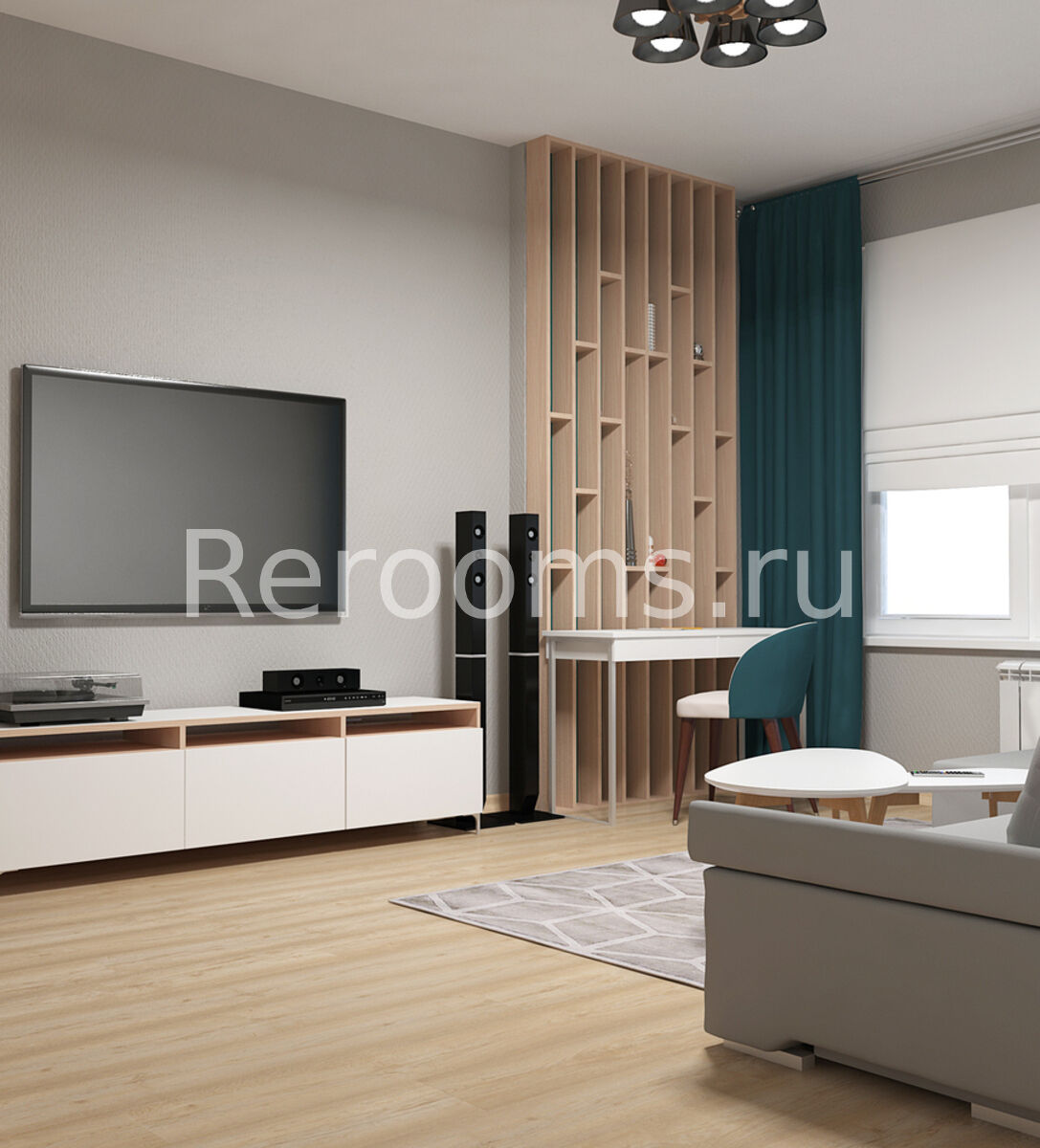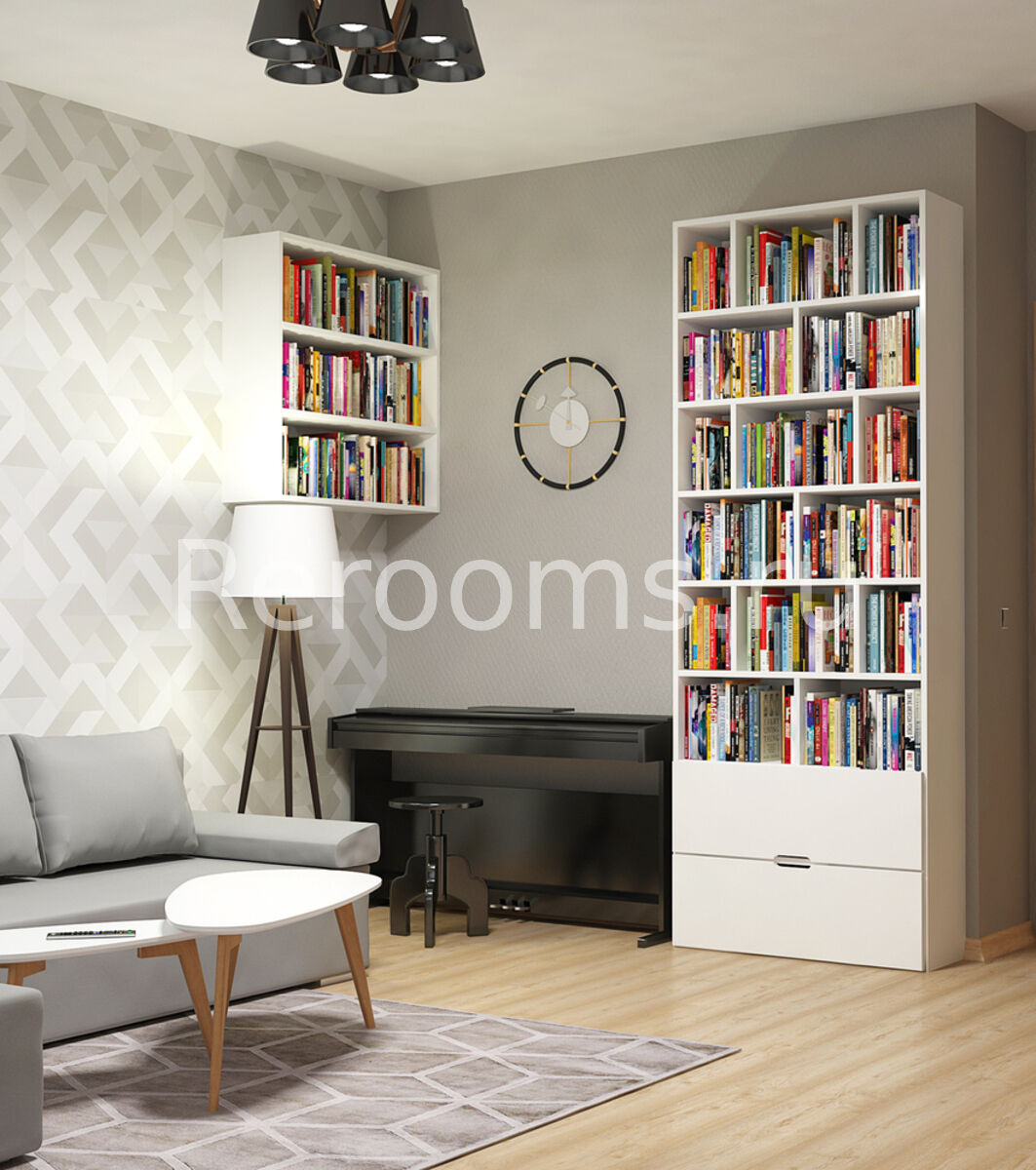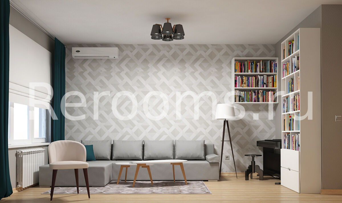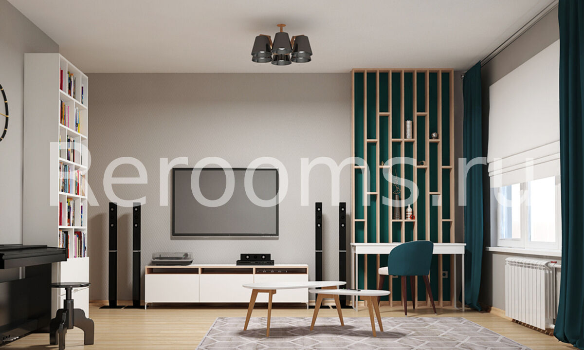 Проект этой комнаты, выполненный в данной стилистике, получился очень смелым и неординарным. Главным фокусным элементом помещения являются полки из светлого дерева. Украшенные декоративными элементами, они сразу приковывают взгляд и придают комнате уютный вид. Мебель, выбранная для проекта, минималистична и функциональна. Светлая цветовая гамма с насыщенными акцентами создает в гостиной ощущение простора и гармонии.