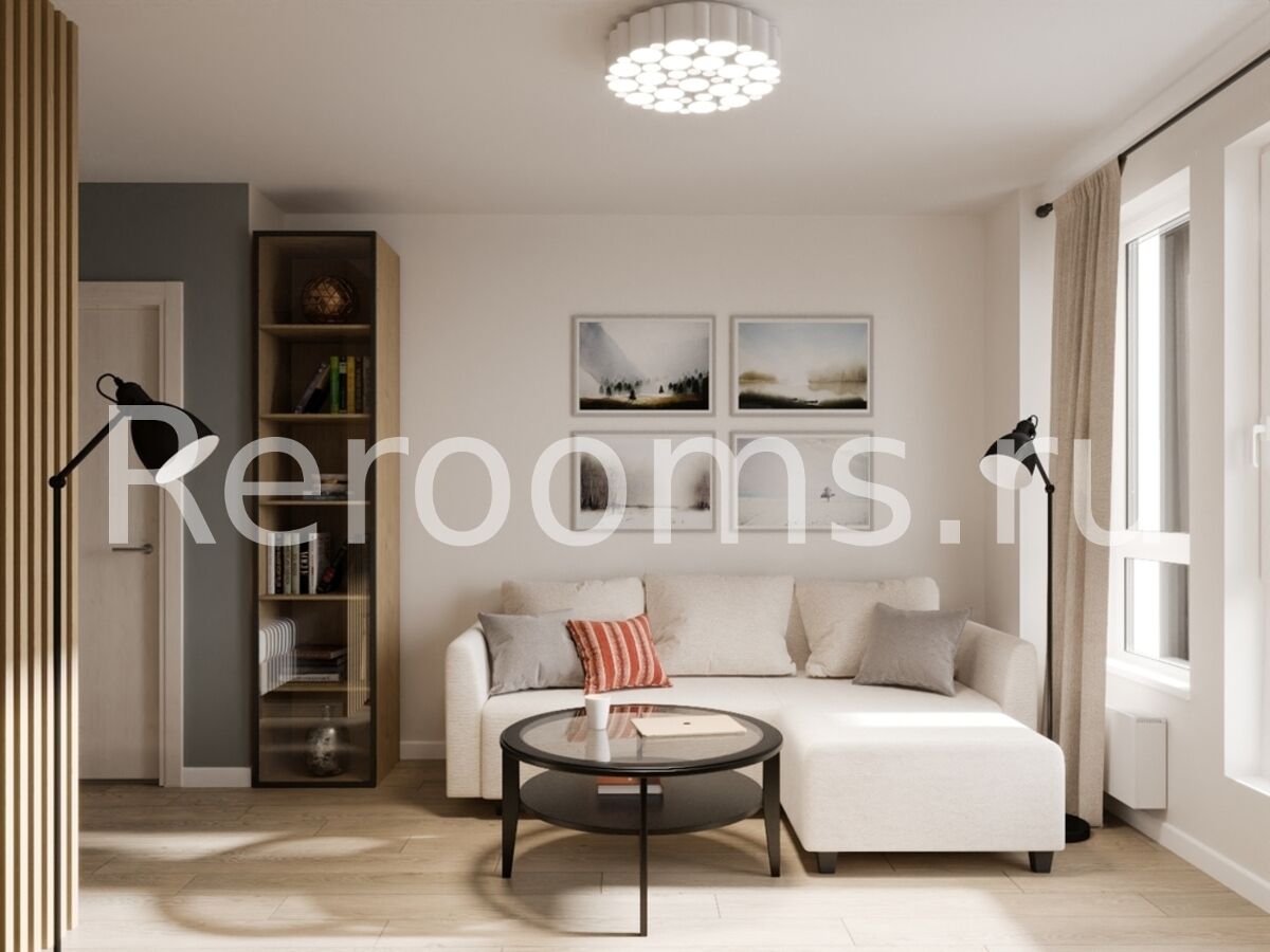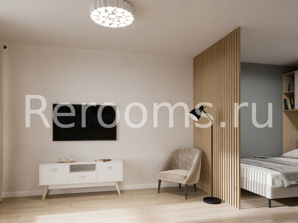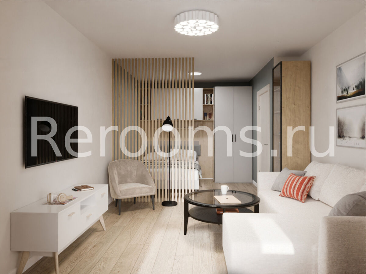 Проект этой гостиной-спальни выполнен в скандинавском стиле. Дизайн отличается простотой, лаконичностью и изысканным видом. В интерьере преобладают светлые тона. Наличие натуральных материалов в отделке и оформлении создает в помещении особую атмосферу тепла и уюта.