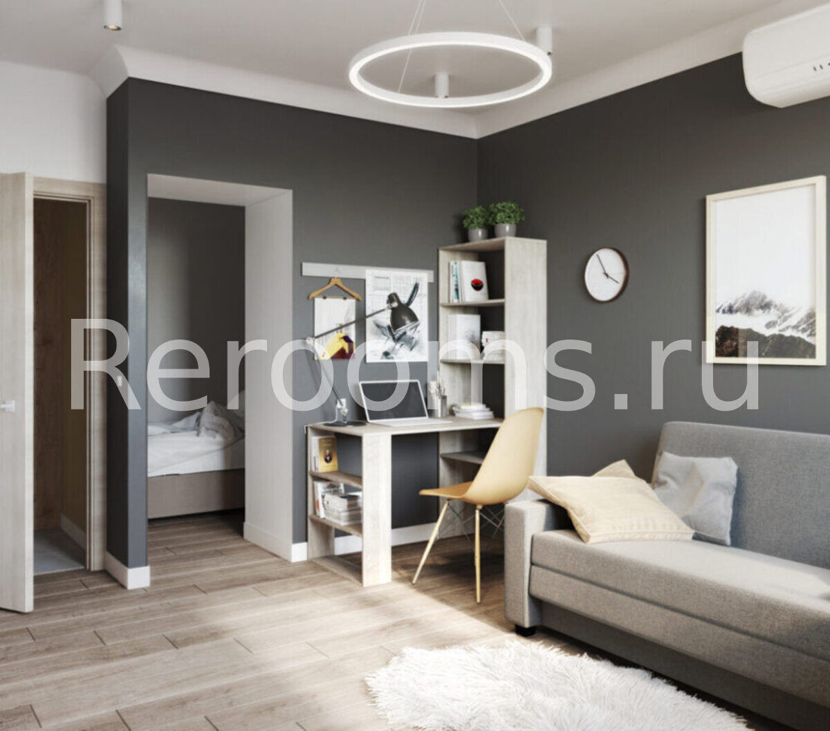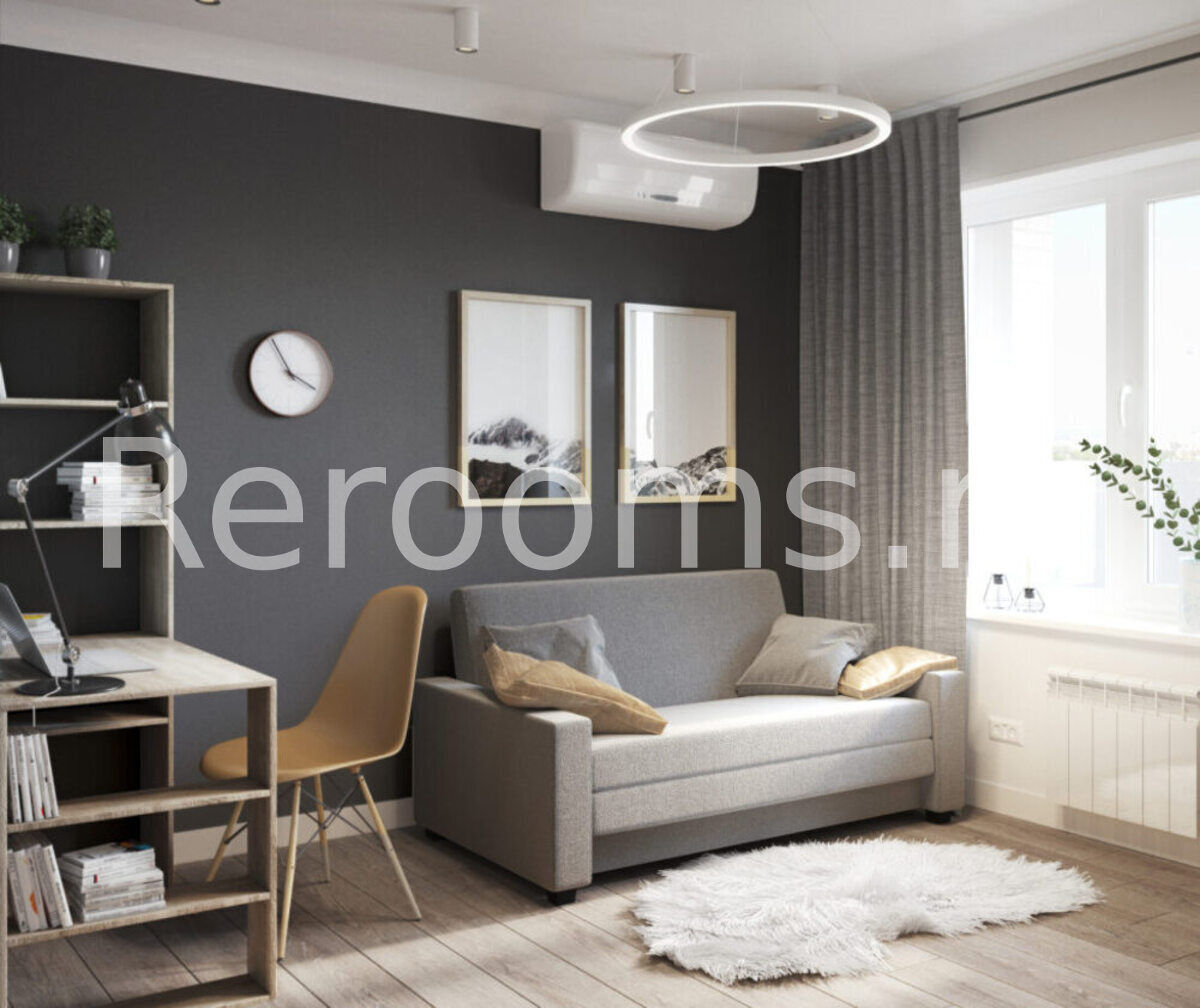 Проект однокомнатной квартиры выполнен в скандинавском стиле и предполагает проживание одного или двух человек. Гостиная комната - самая универсальная зона проекта. Она насыщена разными функциями – это и спальня, отгороженная от основного пространства перегородкой из ГКЛ – в которой встроен гардеробный шкаф; рабочая зона – небольшой, но вместительный стеллаж, необходимое количество электровыводов для техники и подключения дополнительного освещения; зона отдыха – раскладной диван и гостиный гарнитур с дополнительным хранением. Отделка квартиры выполнена в достаточно динамичных оттенках, что произведет впечатление на гостей и хозяев квартиры. Но в целом, образ квартиры не кажется тяжелым, в каждом помещении стена с ярким акцентом уравновешена стеной белого цвета.