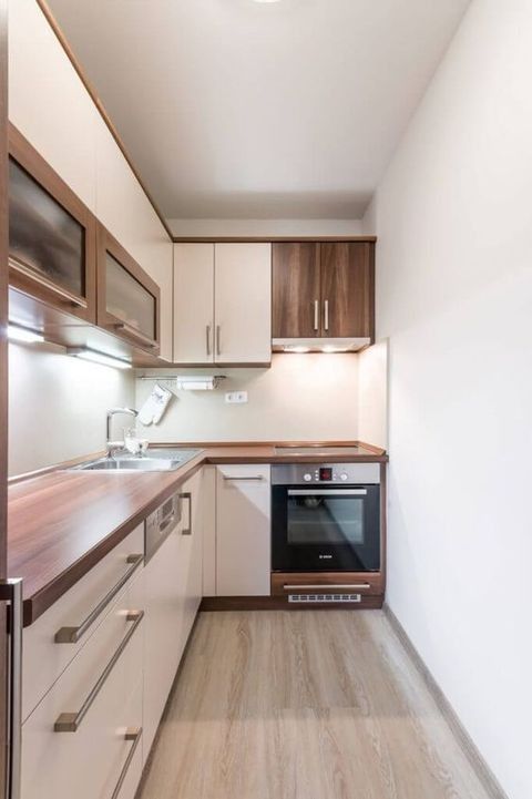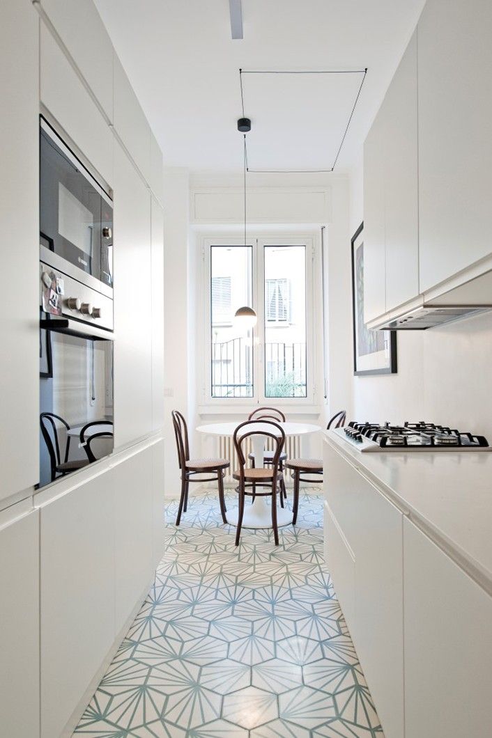 Оптимальная планировка узкой кухни — однорядная (линейная). Установите основную кухонную мебель вдоль одной из длинных стен, чтобы остался проход и место для обеденного стола.