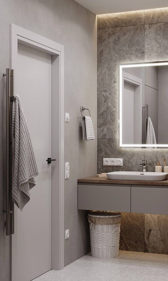 Если для светильников места не хватает, можно избавиться как минимум от одного — возле зеркала. Для этого повесьте в санузле зеркало с собственной подсветкой в раме по всей ее площади.