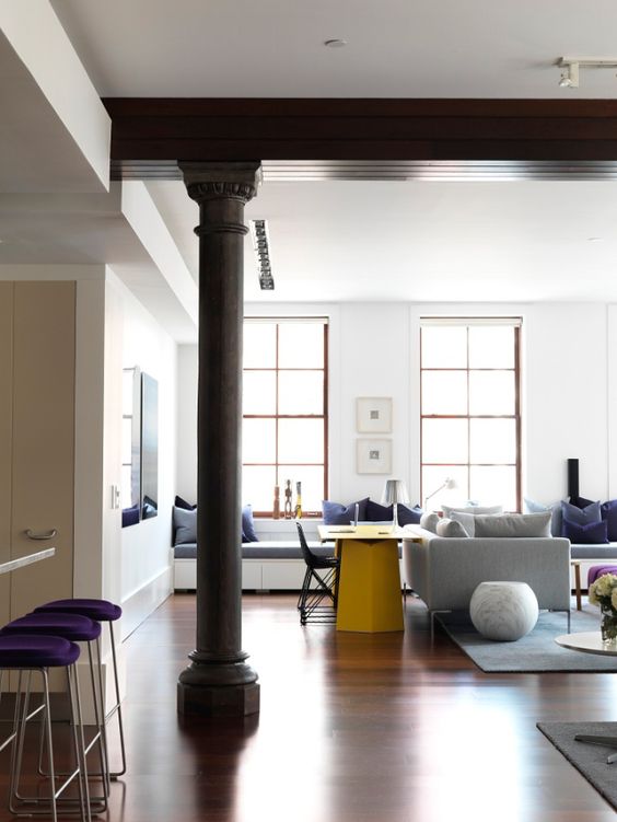 Колонна в стиле лофт или в минимализме выглядит нарочито небрежно, но эта брутальность компенсируется другими приятными взору деталями интерьера. Так что отсутствие отделки у колонн только придаст помещению изюминку.