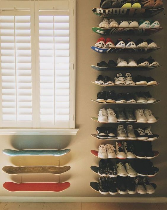 Обувь вполне можно держать и на обычных настенных полках. Но для организации оригинального и интересного пространства располагайте их под углом или в другой необычной форме. Главное — включить фантазию!
