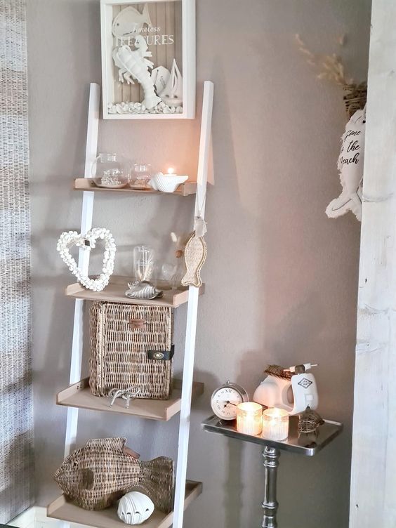 Вместо лестницы можно таким же образом использовать решетку с небольшими ячейками — или напольную, или с креплениями на стену. Если она будет широкой, можно красиво развесить туфли и даже сформировать из них какую-то фигуру. Получаем самобытное декоративное украшение.