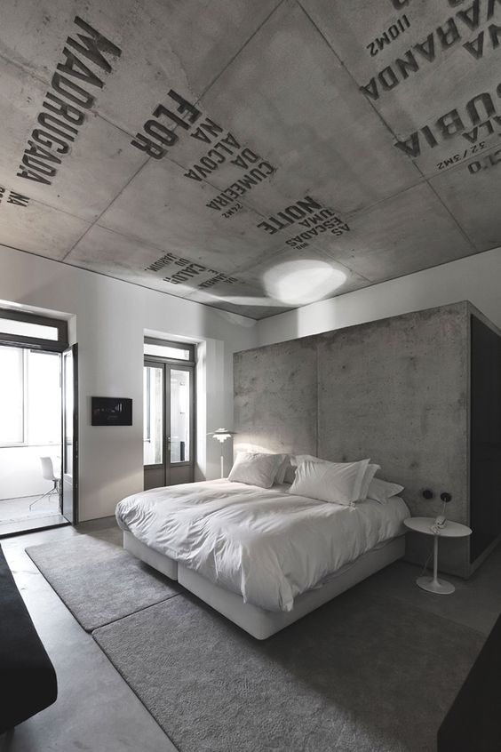 Если ваша спальня оформлена в стиле лофт, ее бетонный потолок можно сделать оригинальным, украсив его фразой или целым текстом по всей площади.