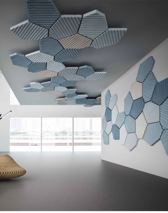 Еще один интересный вариант — расположить потолочные плитки и панели не ровно, а в хаотичном порядке. Такая отделка визуально увеличит пространство комнаты, особенно если использовать материалы светлых тонов.