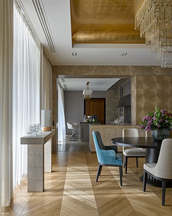 Самым ярким акцентом комнаты станет потолок, который оформлен в виде глянцевой зеркальной поверхности с красивым голографическим эффектом. Это сделает интерьер кухни или столовой очень современным и оригинальным.