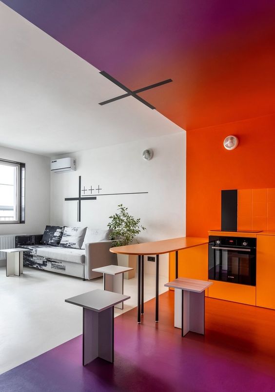Первая идея — украсить потолок ярким абстрактным рисунком из пестрых цветов и оттенков. Если аналогичные цвета будут присутствовать в комнате в виде мебели или декора, интерьер станет более цельным и гармоничным.