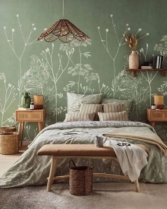 Живые растения — настоящее спасение для интерьера спальни. Они не только делают дизайн более динамичным, но и приносят большую пользу: очищают воздух. Если комната имеет большую площадь, присмотритесь к массивным растениям, если же спальня небольшая, подойдут растения меньшего размера. Сделайте акцент на горшках и вазах. Не хватает места на полу или на полках? Прикрепите растения к потолку или стенам, используя милые кашпо.