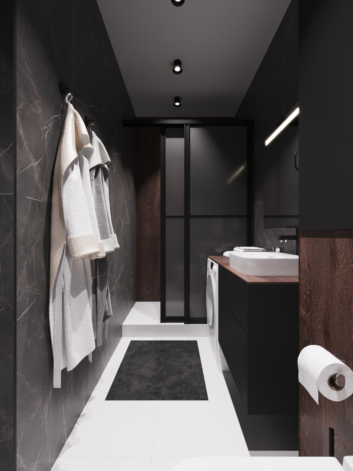 Оригинальное оформление — черная стена под мрамор и другая под дерево.