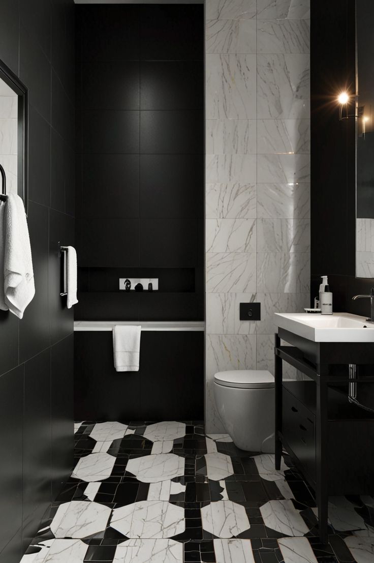 Чередование черно-белых полос — один из универсальных способов оформления санузла.