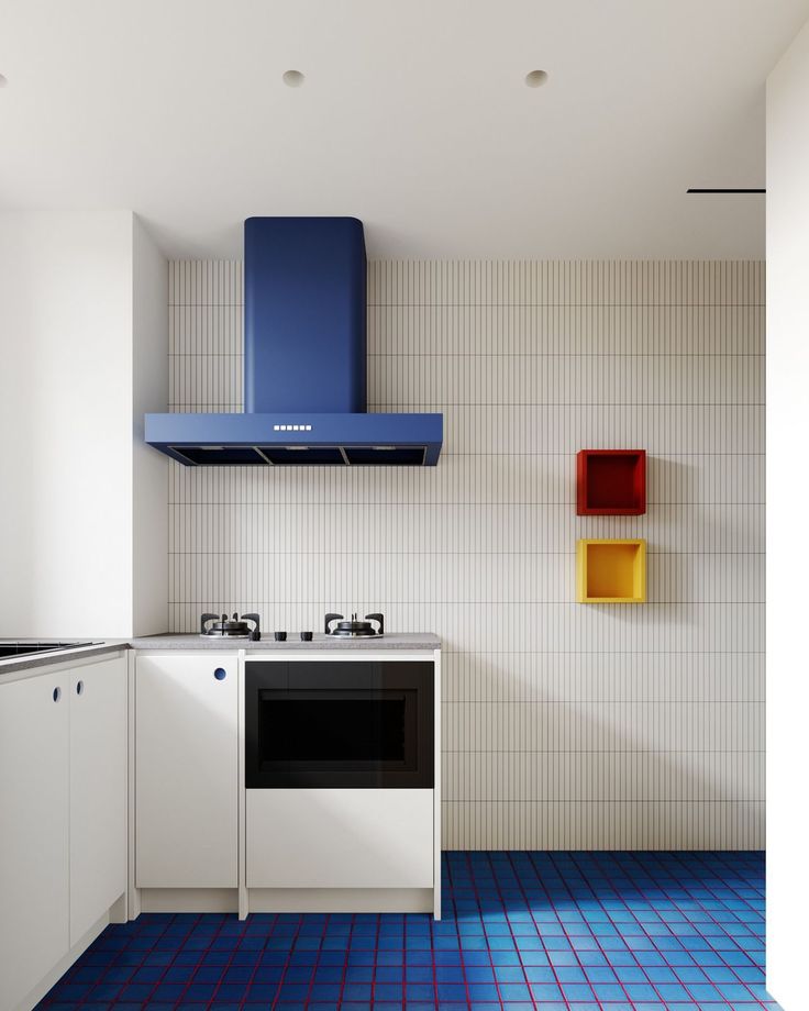 3. Кухня похожа на ожившую картину Мондриана. Будто кто-то взмахнул волшебной палочкой — и наполнение полотна перенеслось в современный мир.