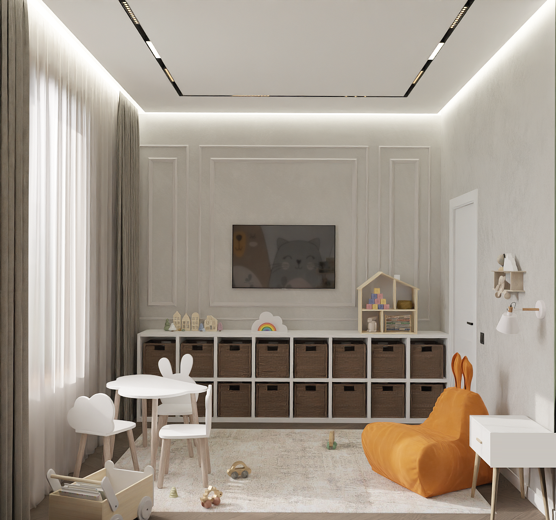 По такому сценарию действовали и дизайнеры ReRooms, которым предстояло оформить интерьер детской для двойняшек-дошкольников в комнате площадью 15 метров. На этапе планировки специалисты решили разделить комнату на две части: на одной стороне разместили спальную зону, обустроенную двумя кроватями-домиками, а на второй — рабочее место и систему хранения, оформленную на входе в комнату платяным шкафом. Центр комнаты сделали игровым участком — его утеплили коврами с ярко-желтым геометрическим принтом, на которых дети смогут поиграть и вместе, и отдельно.