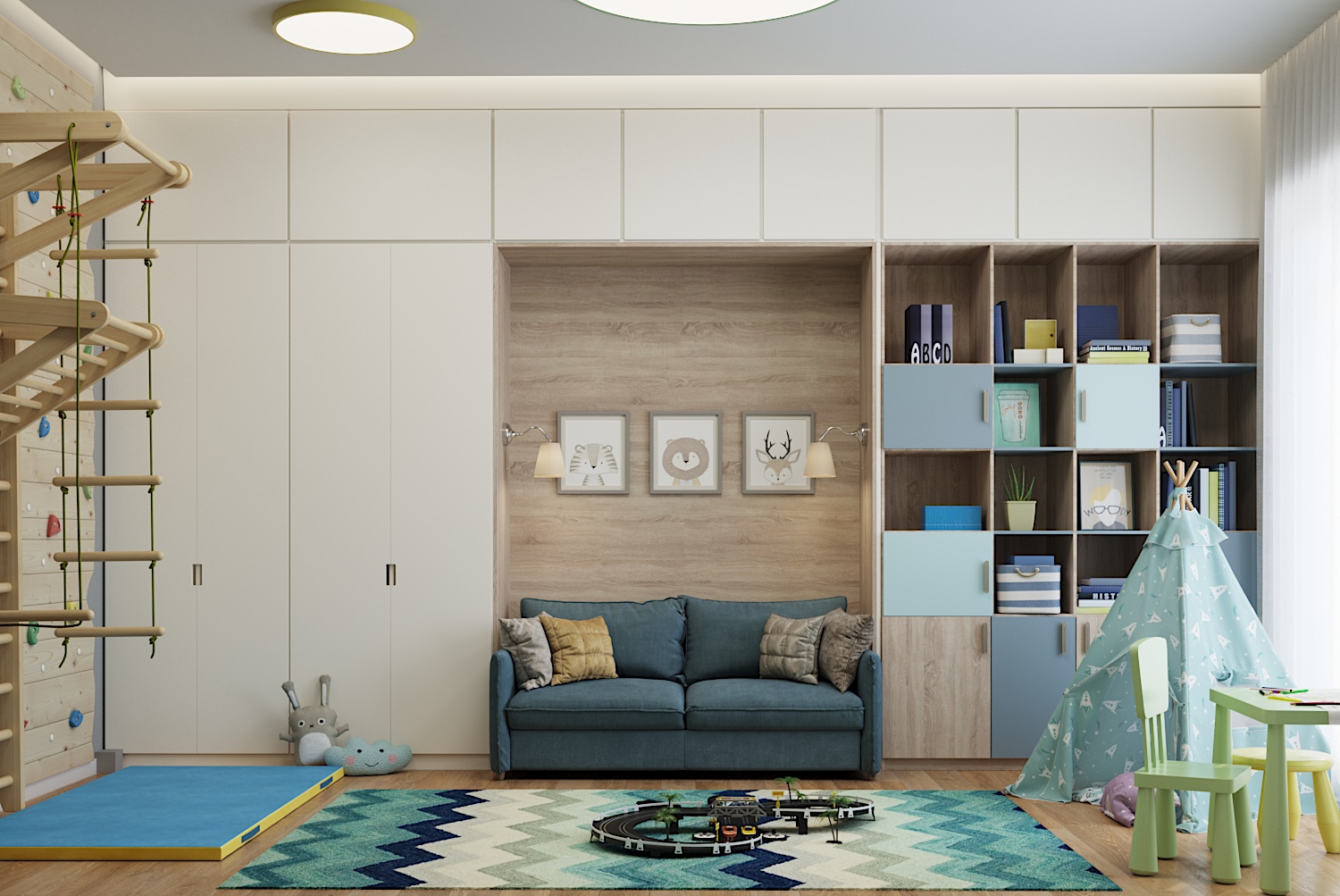 Жилое пространство разделили на две части: вдоль одной стены расположили две кровати-кушетки с открытым стеллажом между ними, напротив организовали вместительную систему хранения — два распашных шкафа для одежды и две тумбы для игрушек. Зонировали пространство цветом, светом и декором.