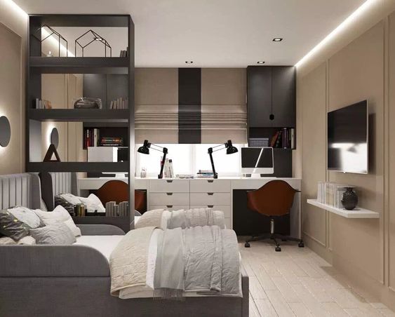 При оформления детской для мальчиков-двойняшек старшего школьного возраста наши дизайнеры выбрали стиль лофт, так как он позволяет воплотить в жизнь все интерьерные запросы подростков и по мере их взросления может видоизменяться без ущерба для функциональности комнаты. Здесь индустриальным шиком пропитан каждый элемент: отделка, мебель, декор и аксессуары — все соответствует модной стилистике, которая уже несколько лет лидирует в интерьерных трендах.