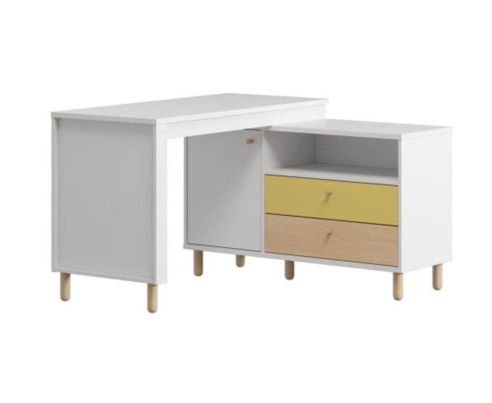 По планировке детская была с выходом на лоджию — этим воспользовались специалисты, чтобы увеличить площадь комнаты. Там организовали рабочие зоны для детей, разместив их напротив друг друга.