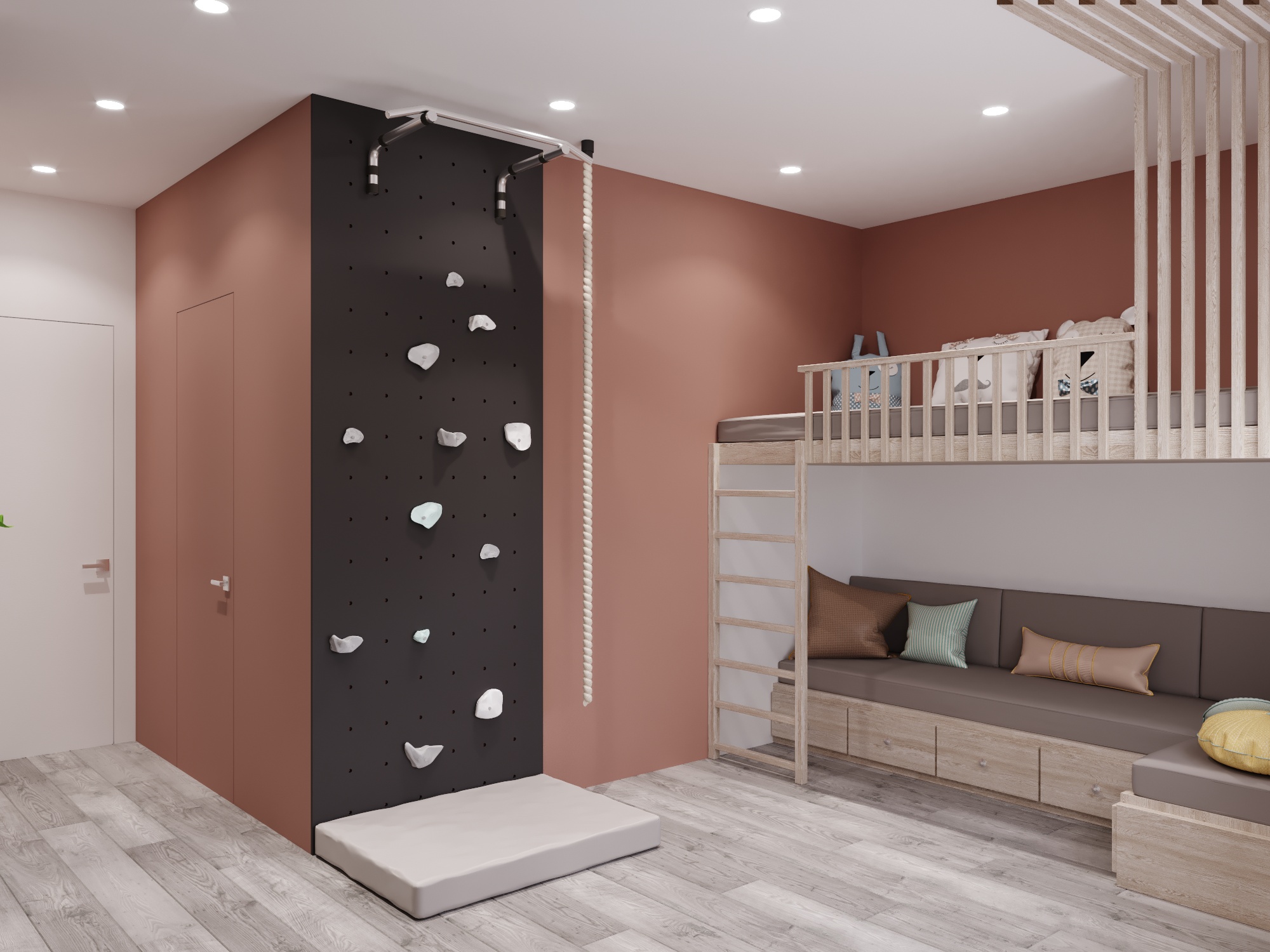 Подвесная кровать-чердак представляет собой одно- либо двуспальное место, расположенное под потолком на высоте примерно полутора метров от пола и выше, — если позволяет вертикальное пространство. По своим эксплуатационным качествам такое место для сна ничем не уступает стандартным кроватям и имеет свои преимущества. Чтобы понять, как будет смотреться такая кровать именно в вашей квартире нужен 3D дизайн проект. Дизайнер учтет все особенности помещения и максимально задействует его площадь.