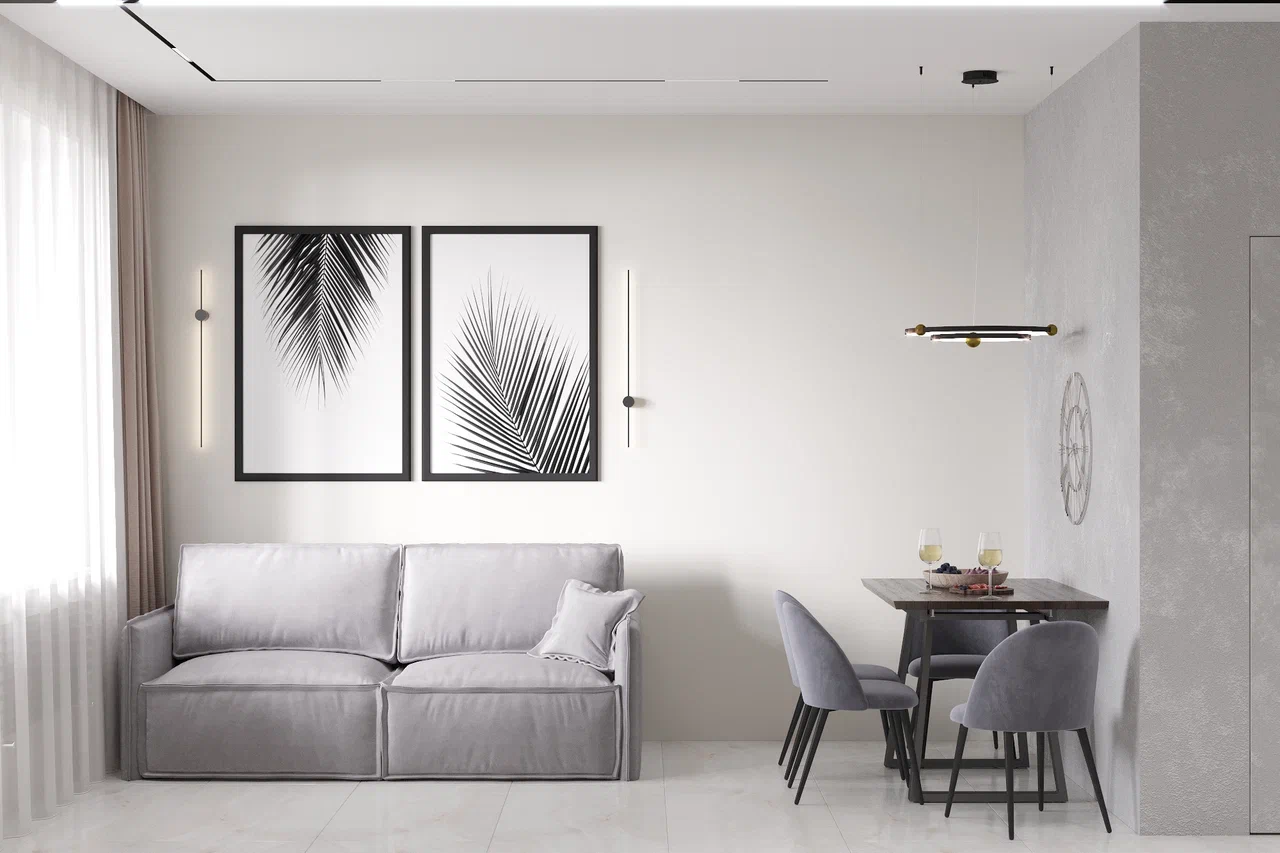 В кухне, совмещенной с гостиной, где много свободного места, поставьте диван по центру. Такое расположение разделит комнату на две разные по функциональности зоны, но даже визуально не сократит пространство.