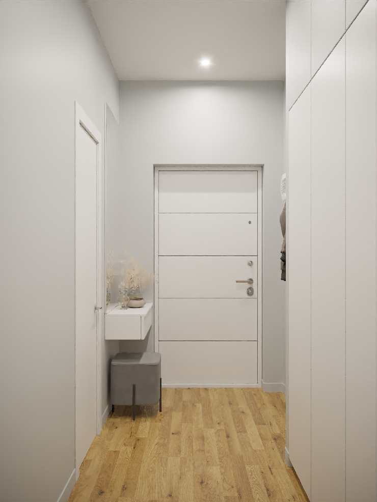 В-четвертых, можно сделать в жилой комнате встроенный шкаф-купе в выступе справа от двери. Закуток удачно расположен, и его будет достаточно, чтобы не загромождать ни комнату, ни прихожую системами хранения.