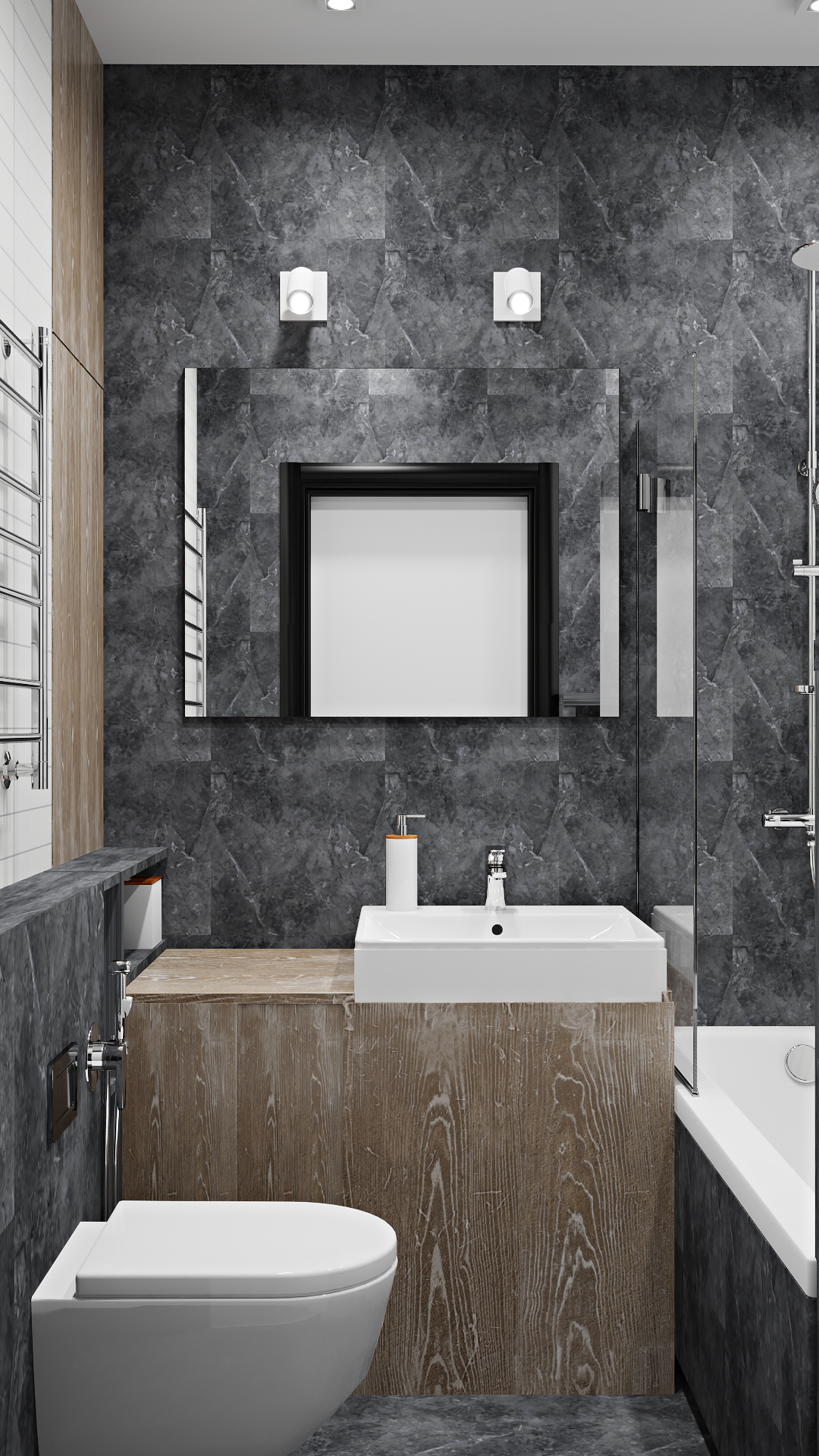 Во-вторых, совмещенную ванную можно сделать сложной конфигурации, увеличив площадь за счет прихожей. Например, перегородка выкладывается не по прямой линии, а дугообразно, до двери на кухню. Приемов по созданию современного дизайна ванной много.